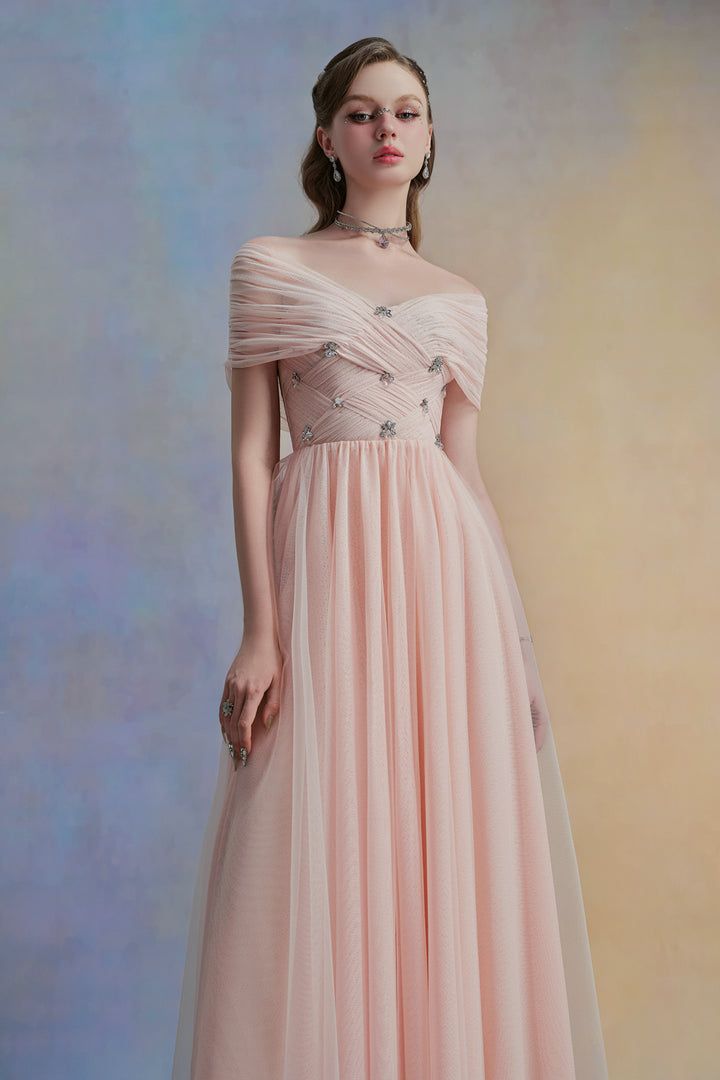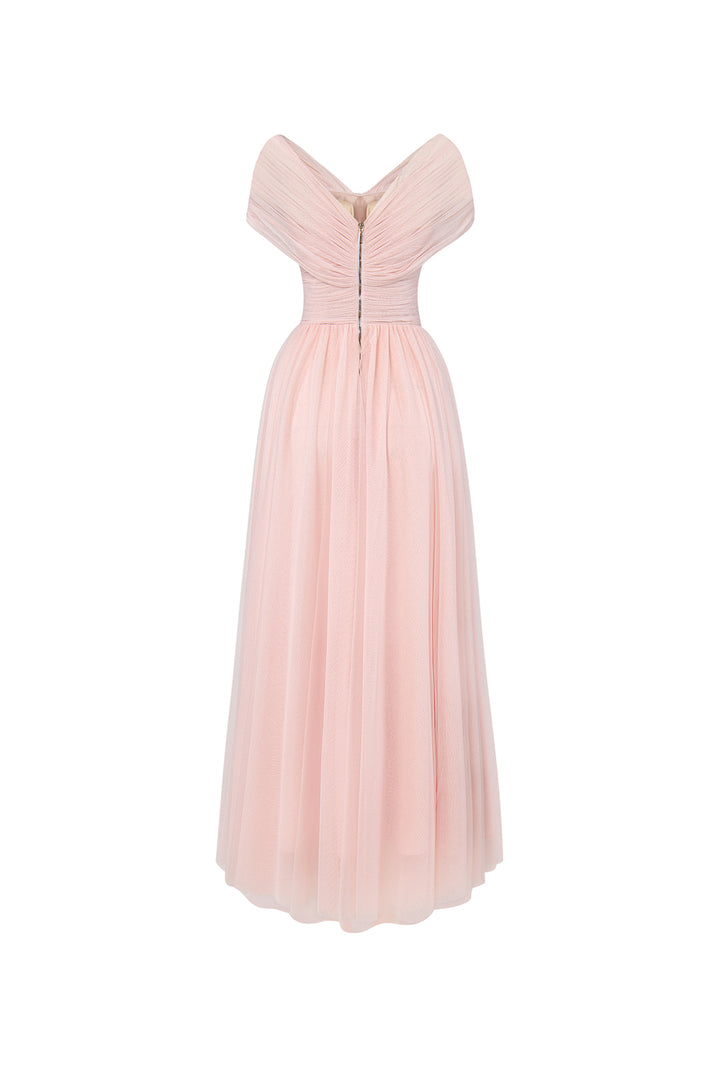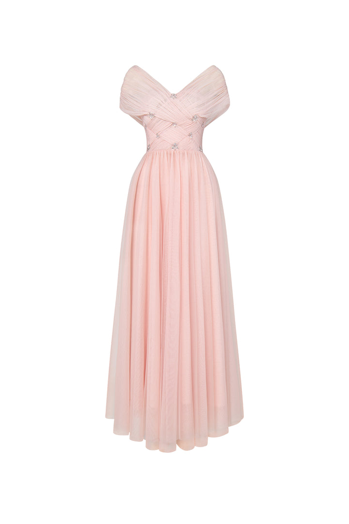 The midi dress features a sophisticated criss-cross ruched bodice that enhances the silhouette with elegant texture. Delicately embellished beads add a refined sparkle, elevating the dress for special occasions. Crafted from lightweight tulle, this midi-length dress offers both comfort and graceful movement, making it a versatile choice for formal events.