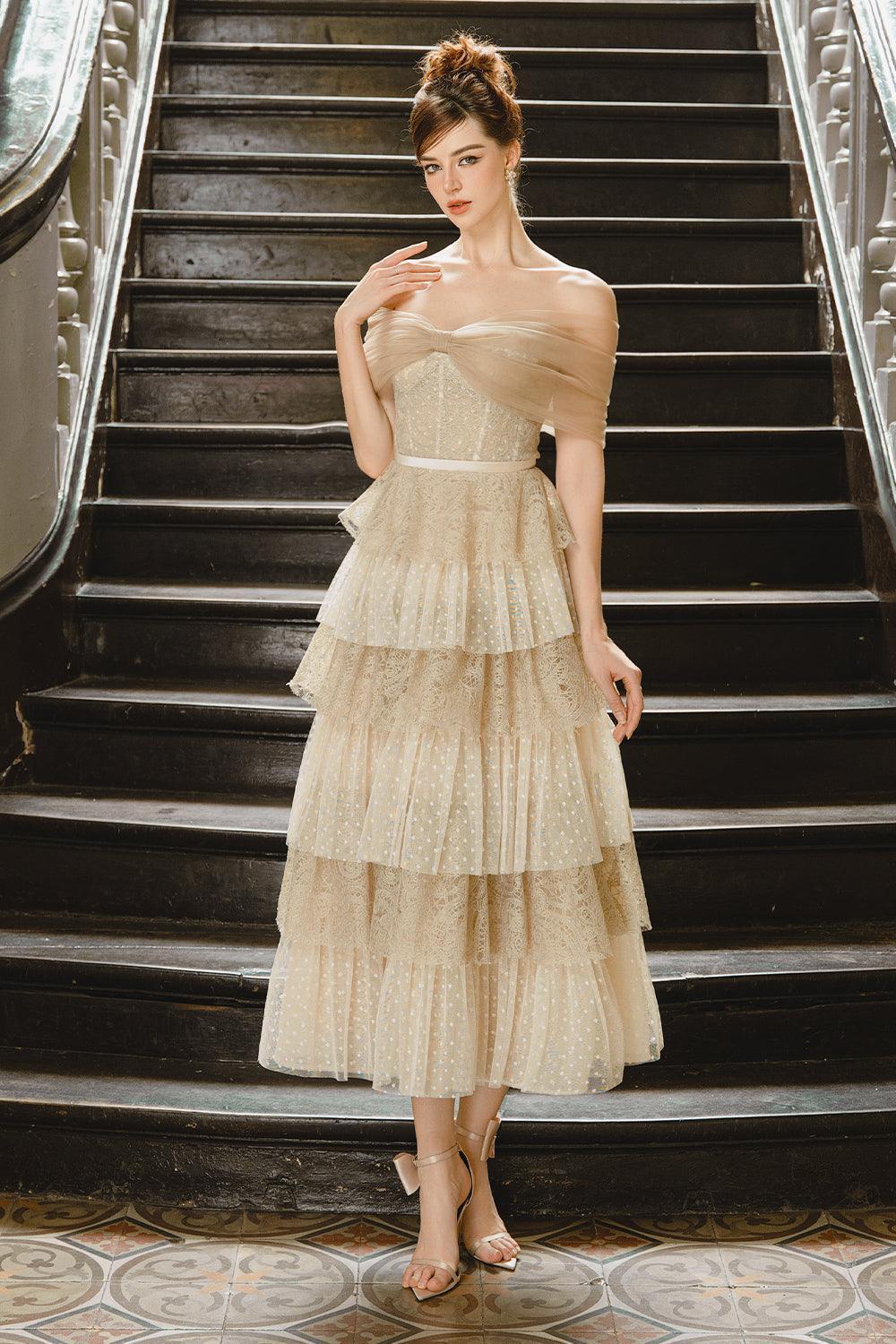 Solara Layered Off-Shoulder Tulle Ankle Length Dress