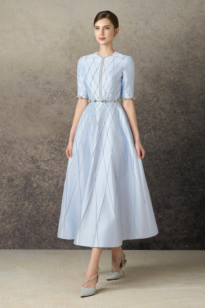This dress features a sophisticated diamond-shaped pattern intricately combined with delicate bead lines, enhancing its elegant taffeta fabric. Designed with a round neck and calf-length hem, it offers a refined silhouette perfect for formal occasions. The blend of structured patterning and subtle embellishments creates a timeless piece that balances classic style with expert craftsmanship.