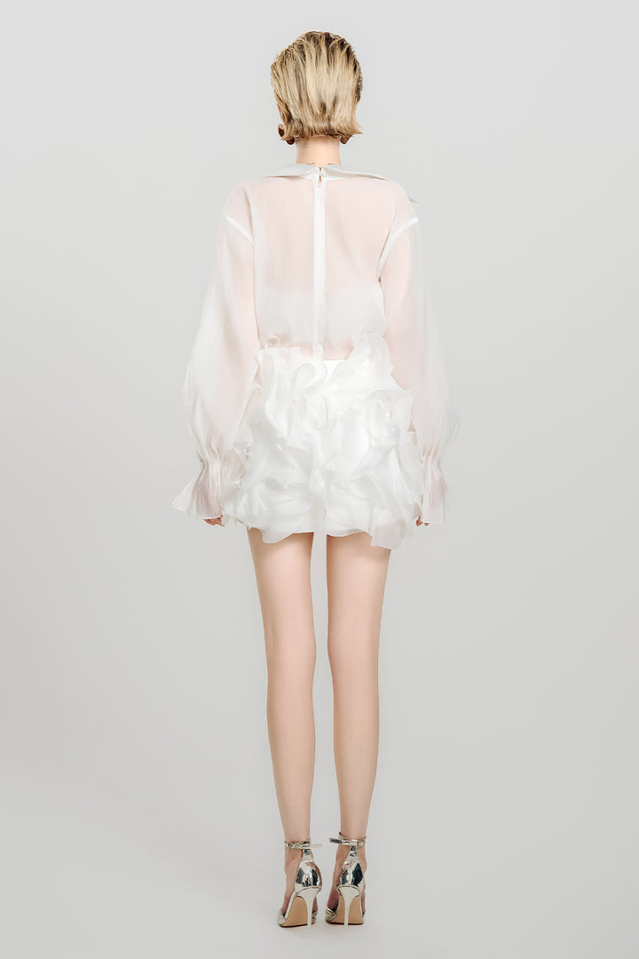 The set combines delicate transparency with relaxed elegance. Crafted from lightweight sheer chiffon, the blouson top offers a softly gathered silhouette that enhances movement and comfort. Paired with a coordinating mini skirt, this set creates a harmonious balance of airy sophistication and modern style, perfect for upscale daytime events or chic evening occasions. Expertly designed for a refined yet effortless look.