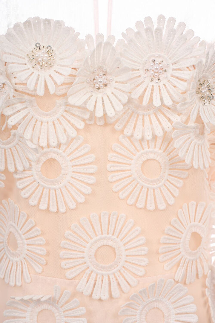 Special Features Flowers and beads applique, Horizontal on the skirt, Sheer puffy sleeves and lower skirt, Mesh cut-out on the back