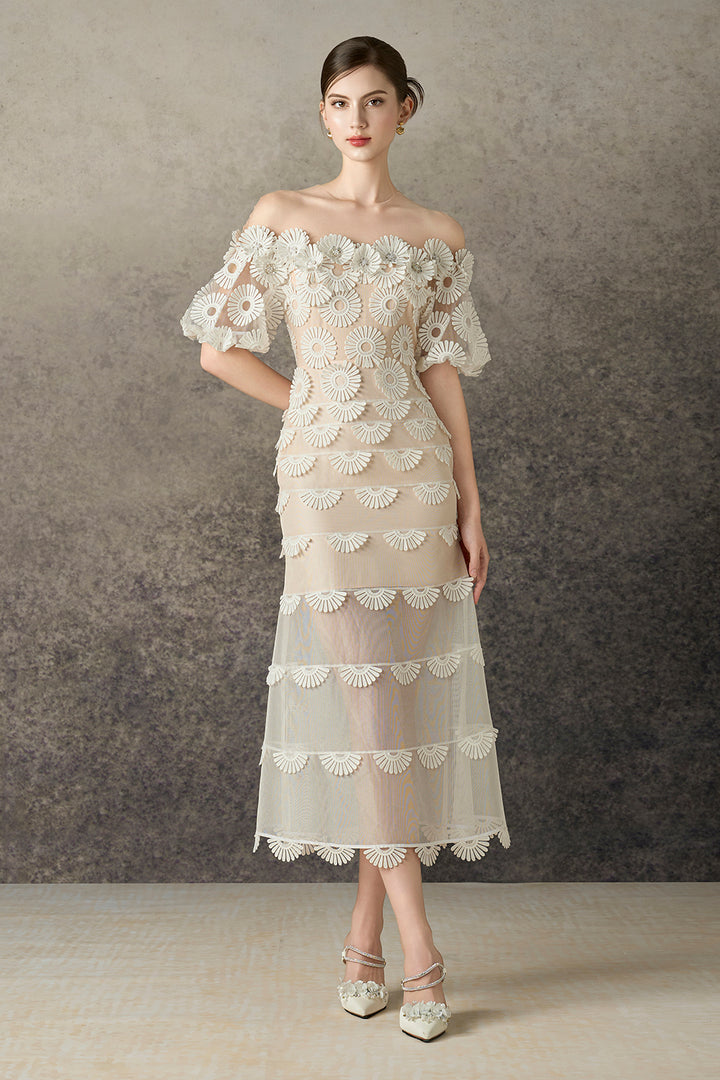 The dress showcases a sophisticated mermaid silhouette that contours the body elegantly. Featuring intricate 3D floral appliqués, the dress adds depth and texture to its delicate lace fabric. The illusion neckline enhances its refined appeal, while puff sleeves introduce a subtle yet stylish volume. Designed for a graceful fit and timeless elegance, this dress is ideal for formal events where a blend of classic and contemporary details is desired.