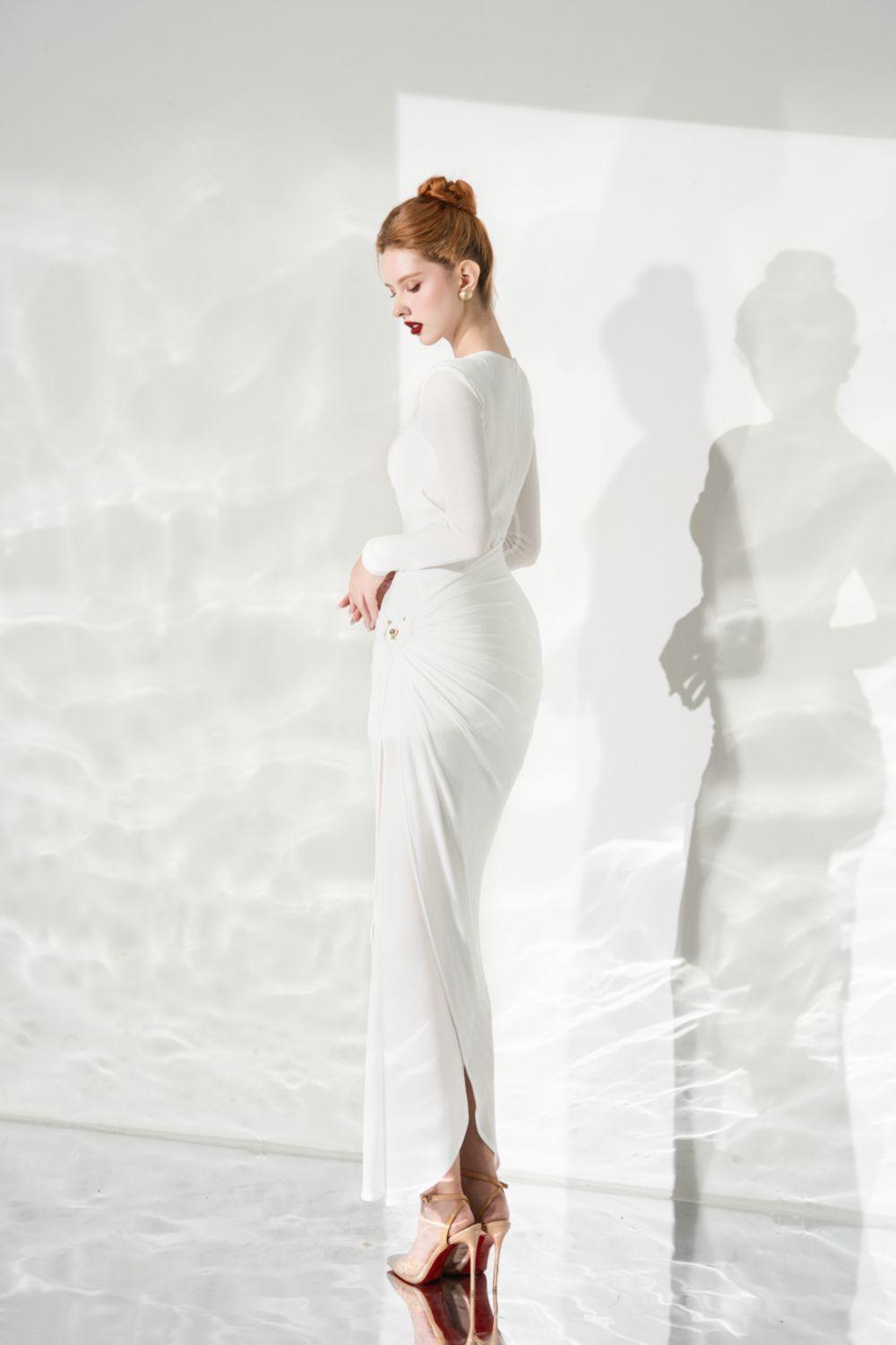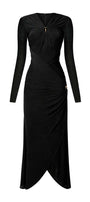 يتميز هذا الفستان الفاخر بألياف لدنة مجمعة للحصول على صورة ظلية تعانق الجسم وحاشية بطول الكاحل لإضفاء لمسة راقية. مثالي لأي مناسبة خاصة، هذا الفستان سيجعلك تشعرين بالثقة والتألق.
