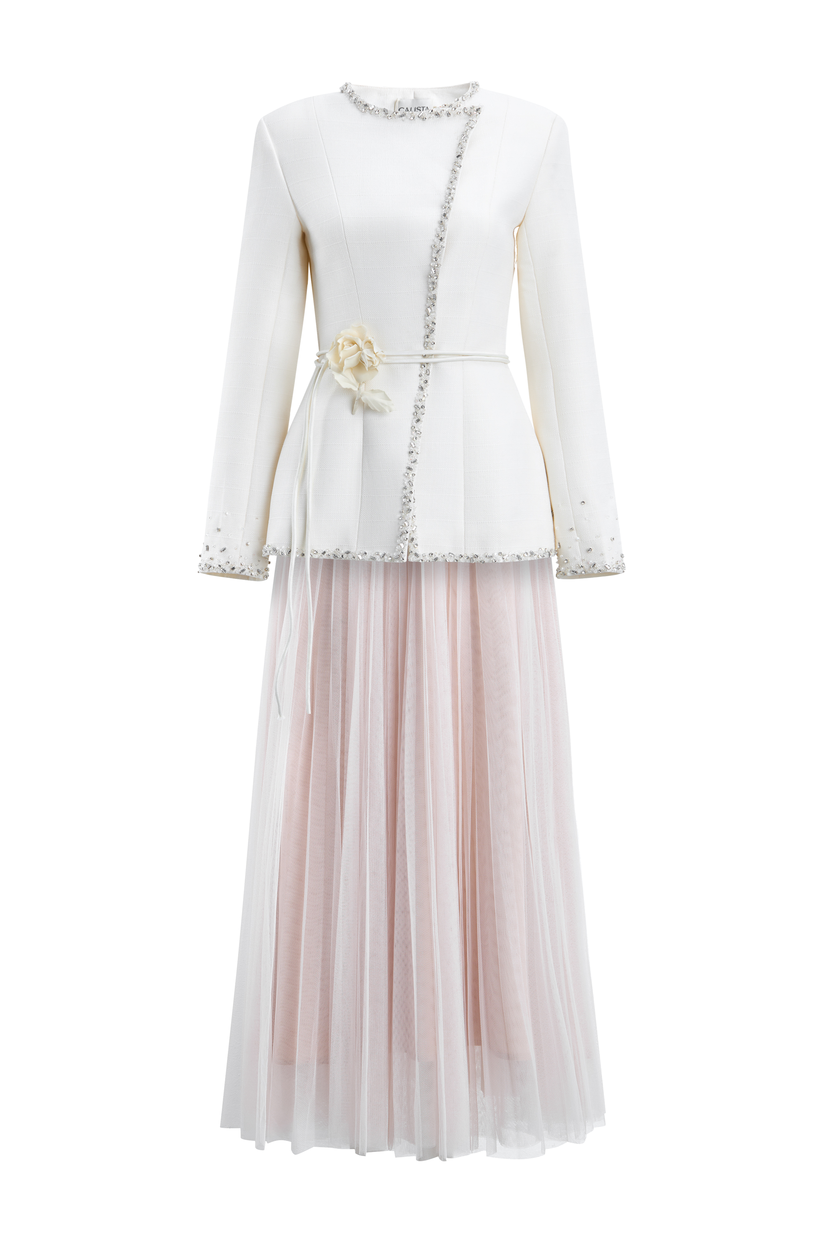 Elevate your style with this expertly crafted A-line set, featuring a round neck, regular sleeves, and pleated canvas. Adorned with rhinestone and applique embellishments for a sophisticated touch. Perfect for formal events, evening gatherings, and special celebrations.