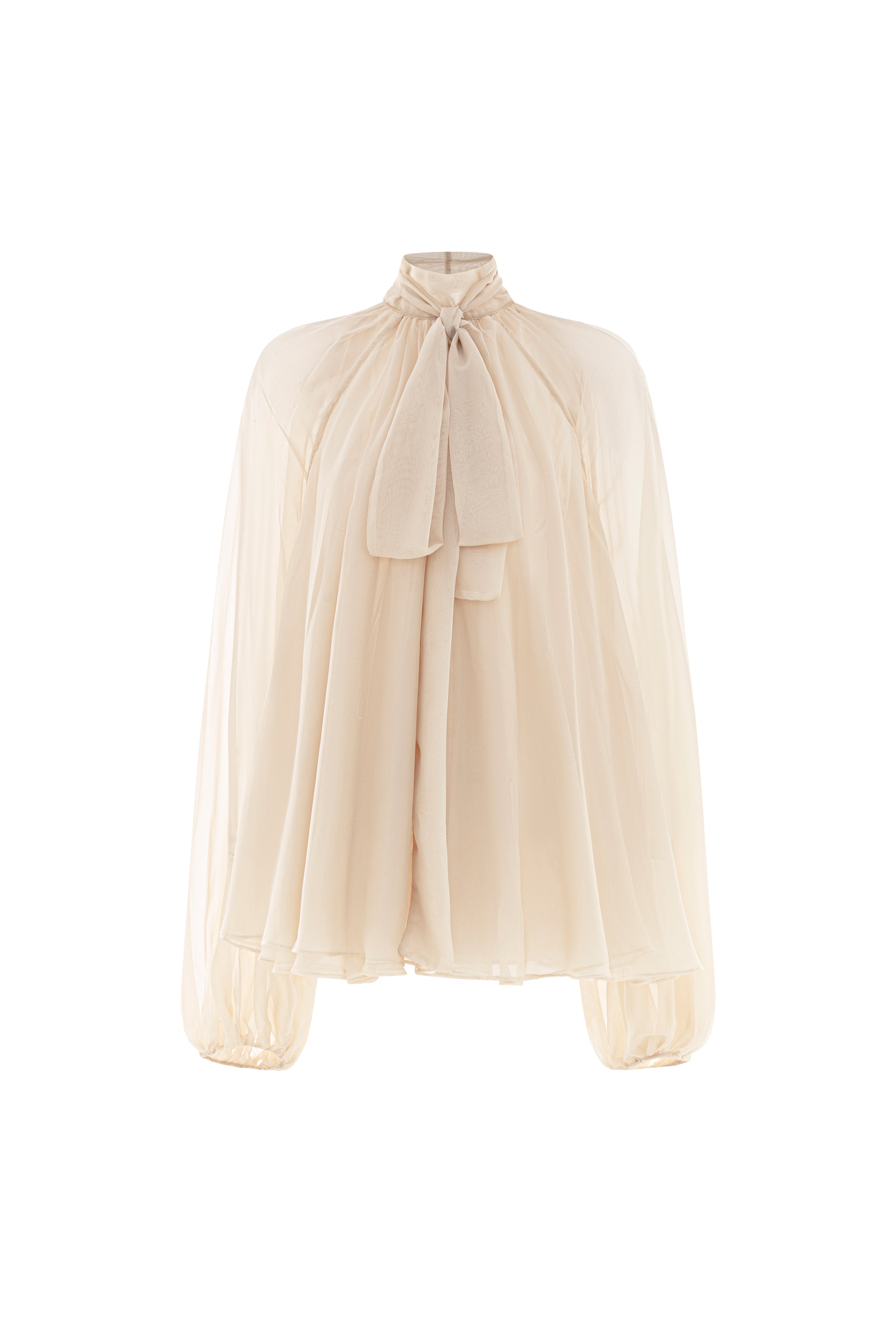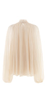 Expertly tailored from luxurious silk, this blouson set features a sophisticated high neck, elegant cape sleeves, draped details, and refined applique embellishments. Ideal for formal gatherings, cocktail events, or upscale celebrations.