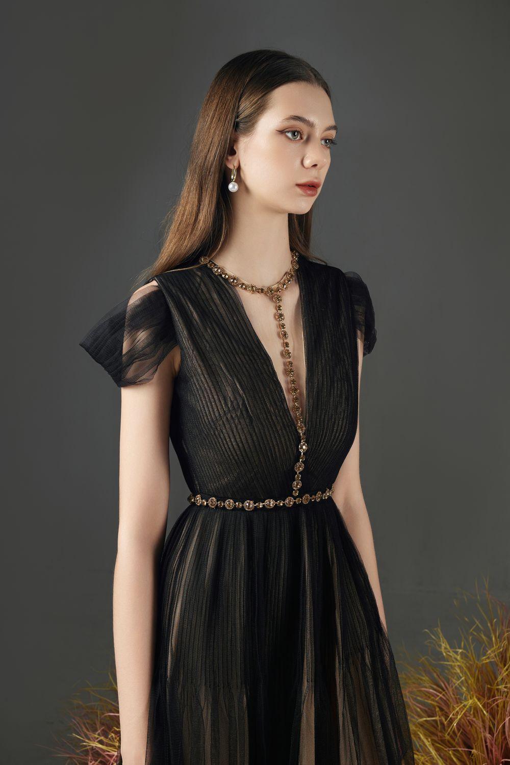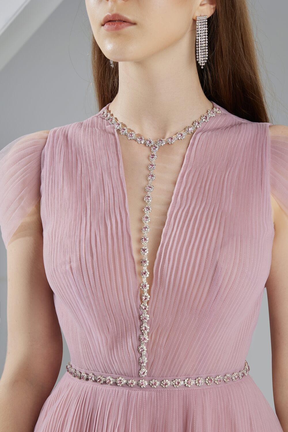 أحجار الراين متصلة على طول الخصر وخط العنق, قصة على شكل حرف V شفافة على الصدر
