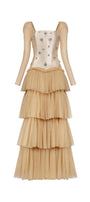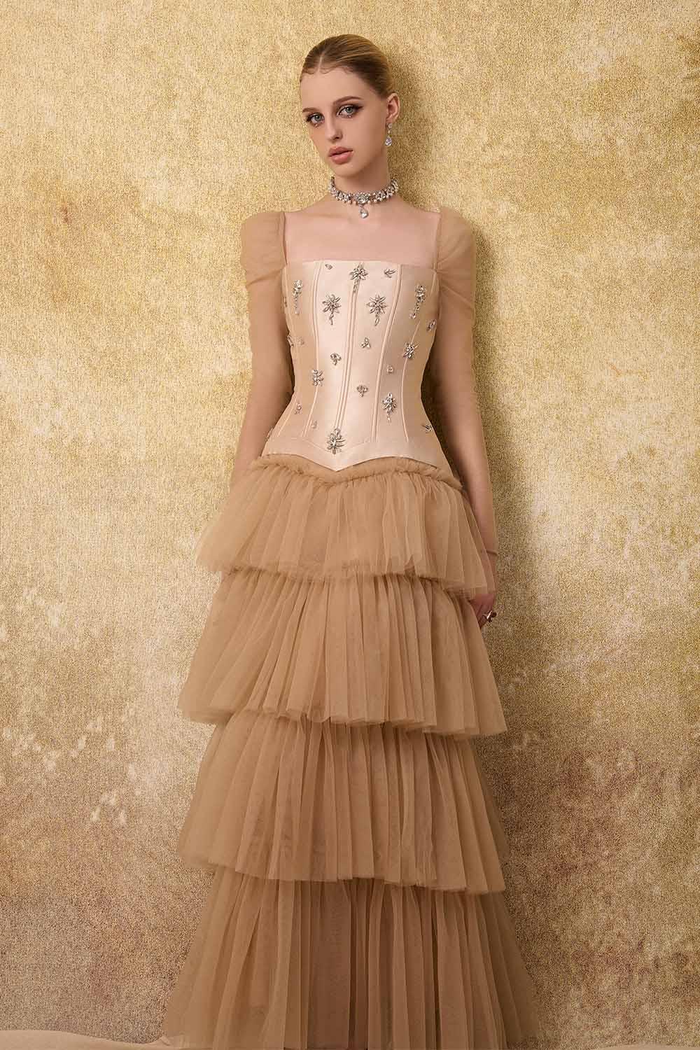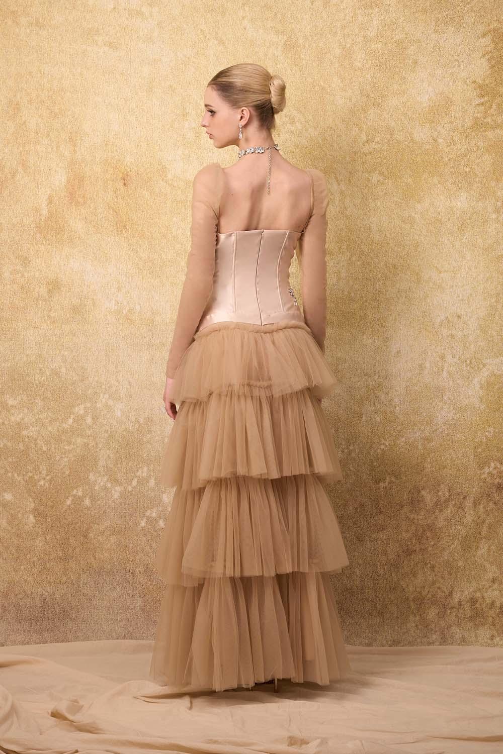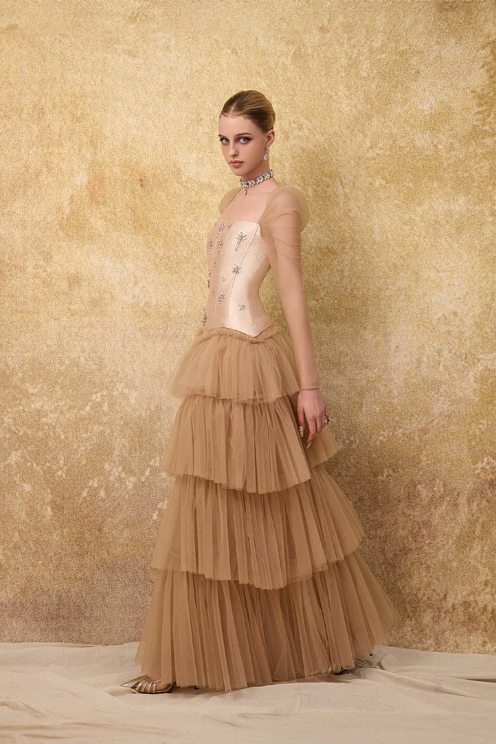 Imperium Layered Corset Waist Mesh Taffeta Maxi Dress