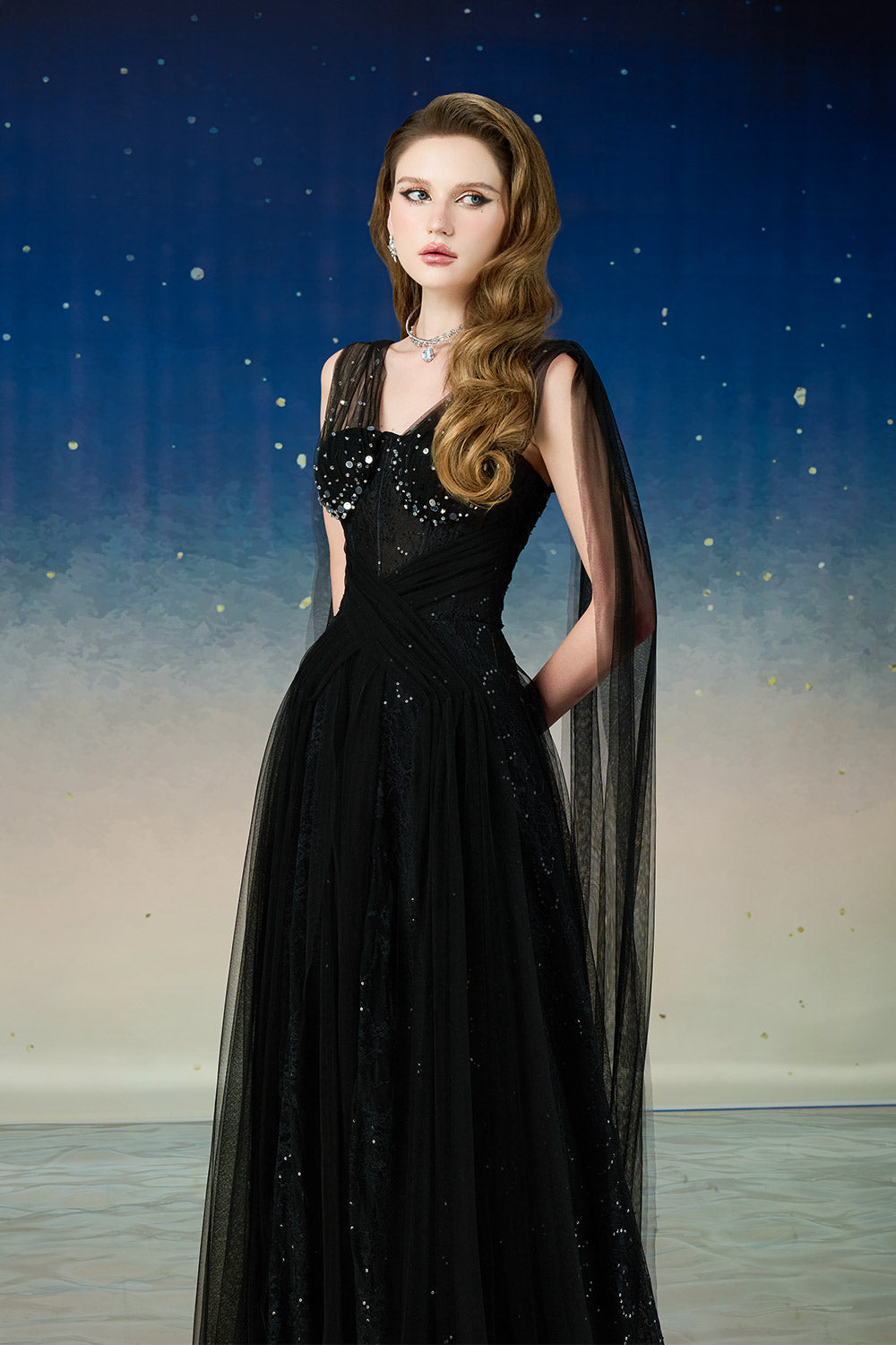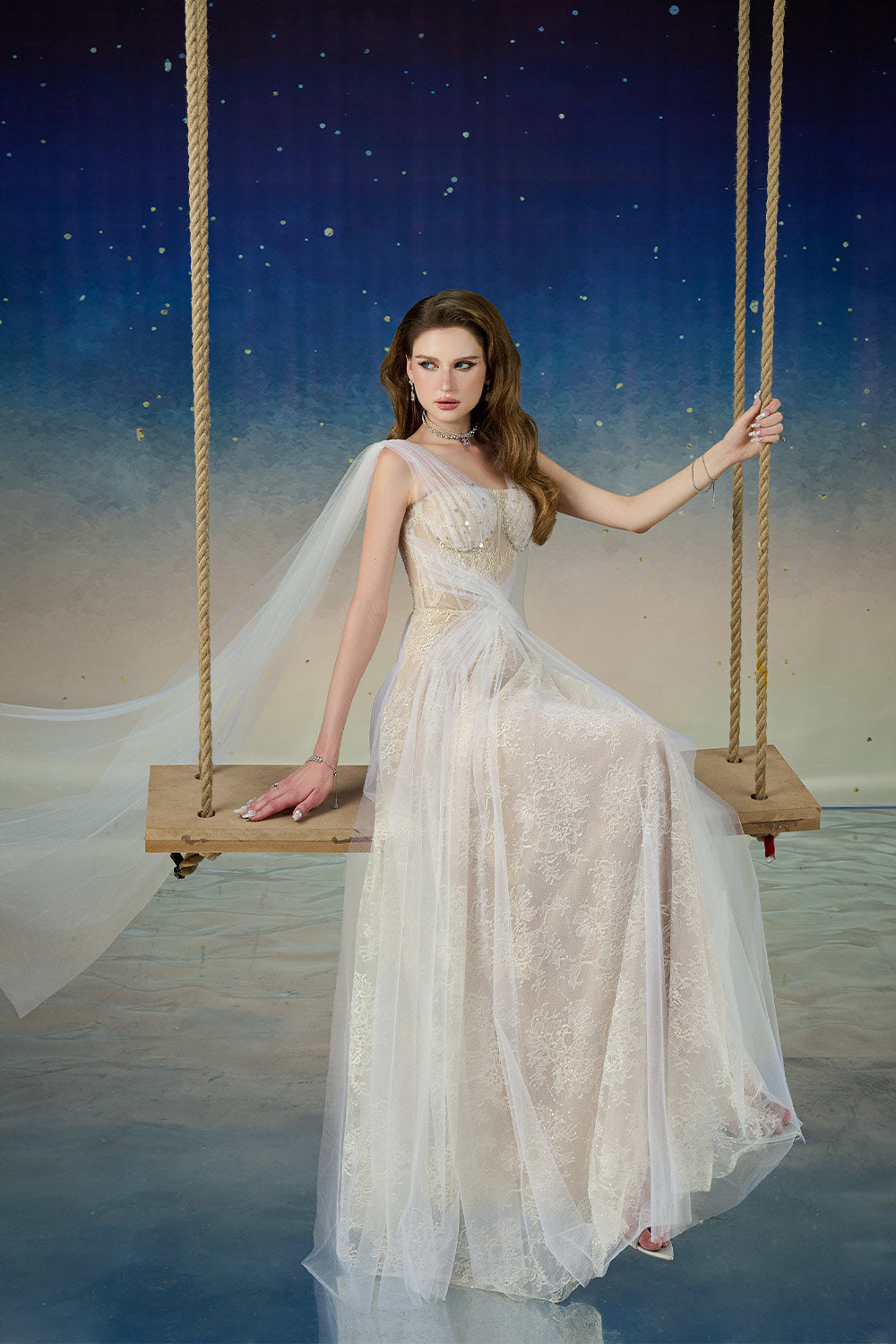 Nyxara A-line Symmetric Flap Mesh Lace Floor Length Dress