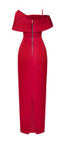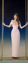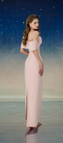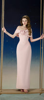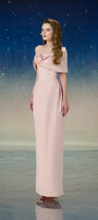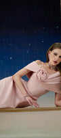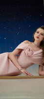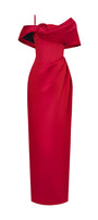 Cinched waist with boning, Draped off-shoulder into a rose on the chest, Slit back, Asymmetric sleeves with spaghetti straps