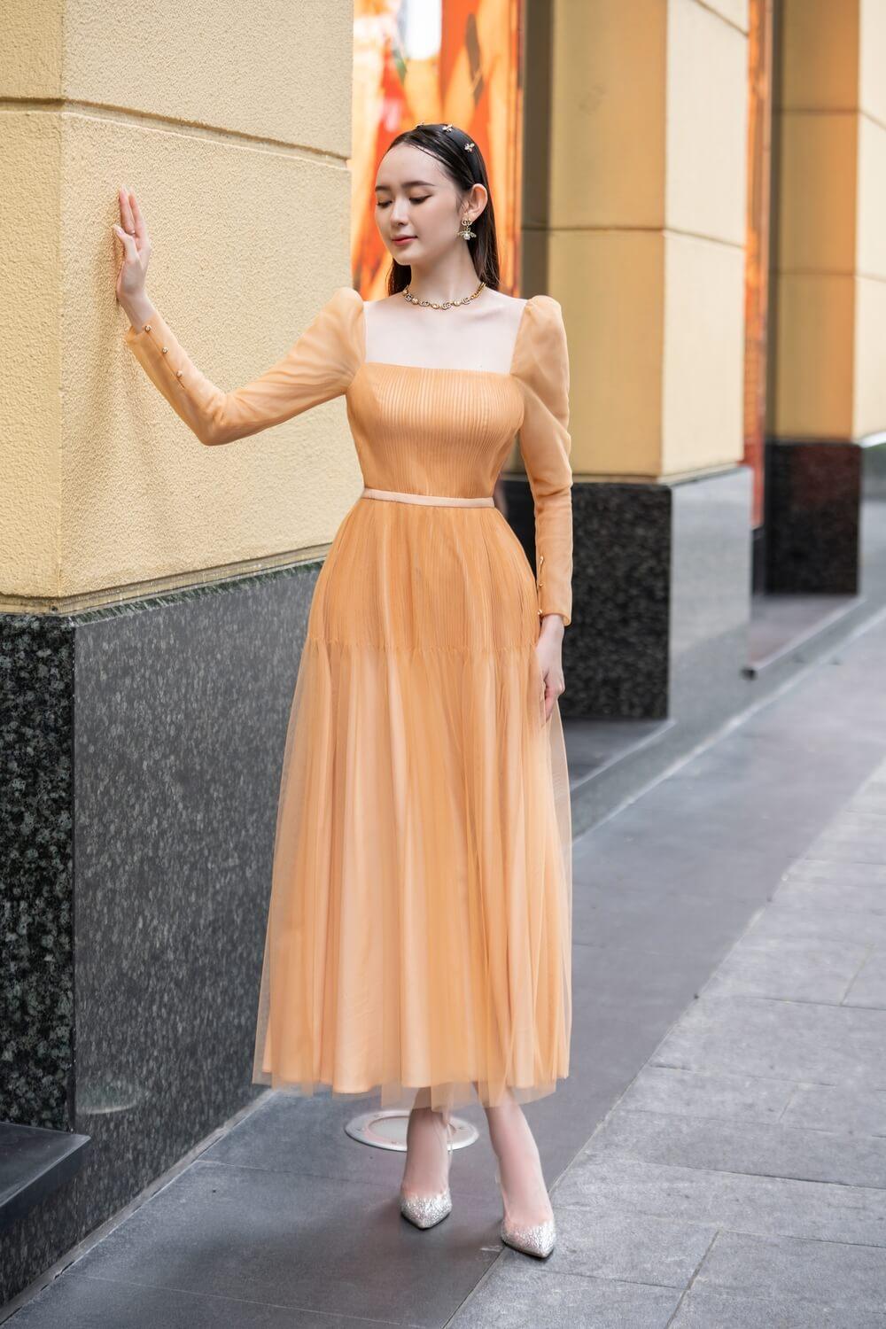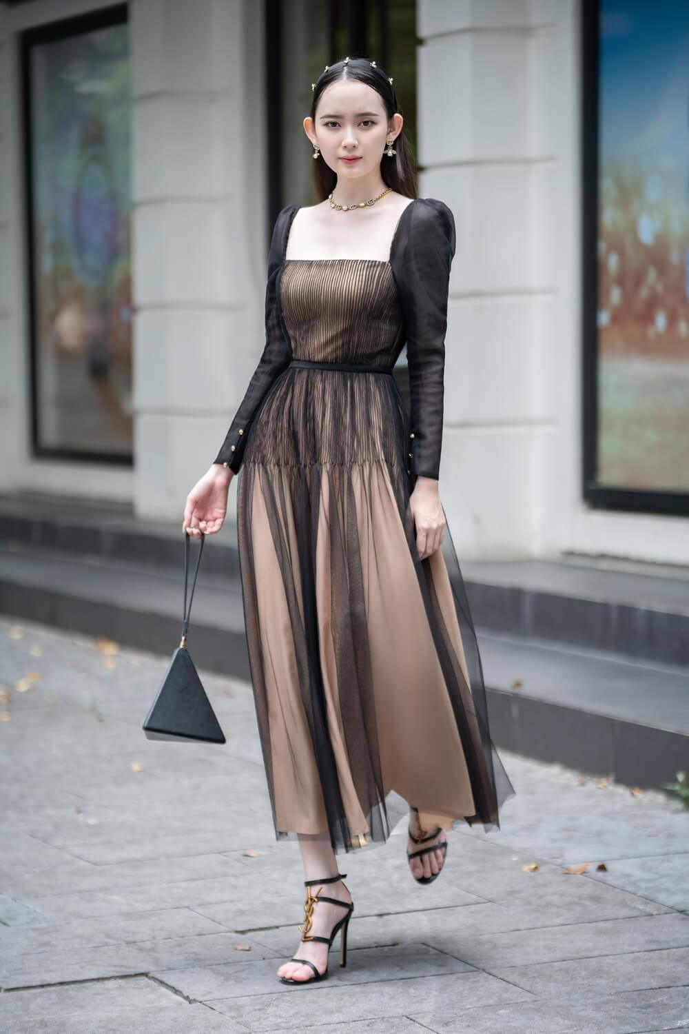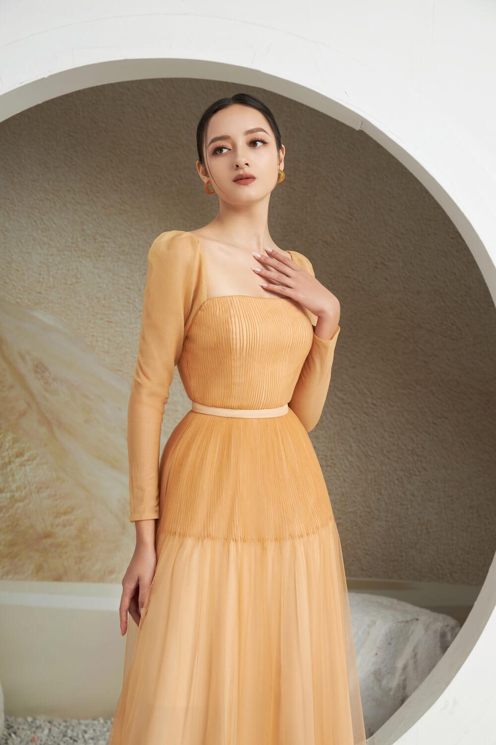التصميم مصنوع من قماش شبكي ناعم مع تقنية طيات فاخرة، وأكمام طويلة، وأكتاف منتفخة. خط العنق المربع كلاسيكي وحديث على حد سواء، مما يمنح السيدات مظهرًا أنثويًا وحنينًا.