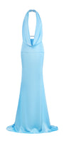 This dress features a sophisticated cowl neck with a halter design, creating an elegant neckline that gracefully frames the shoulders. Crafted from a luxurious silk blend, the floor-length silhouette hugs the body with a mermaid cut, enhancing natural curves while offering a refined, polished look. The strategic cut-out detail adds a modern edge, making this dress an expert choice for formal occasions where style and subtle allure are paramount.