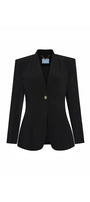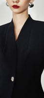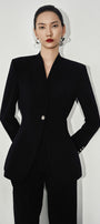 The unique mandarin collar and sleek, lapel-less design give a modern and sophisticated look. The structured fit enhances the silhouette, making it a versatile piece for any occasion.
