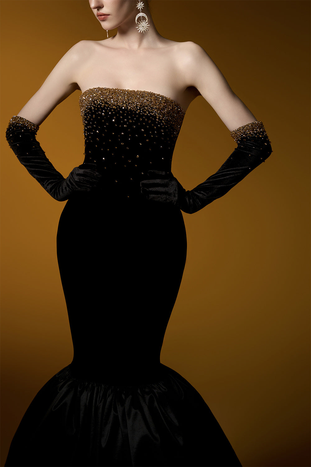 This velvet floor-length dress features a mermaid cut and straight across neckline, creating a flattering and elegant silhouette. Perfect for formal occasions, this dress exudes sophistication and style. Embrace its luxurious texture and timeless design for a truly captivating look.