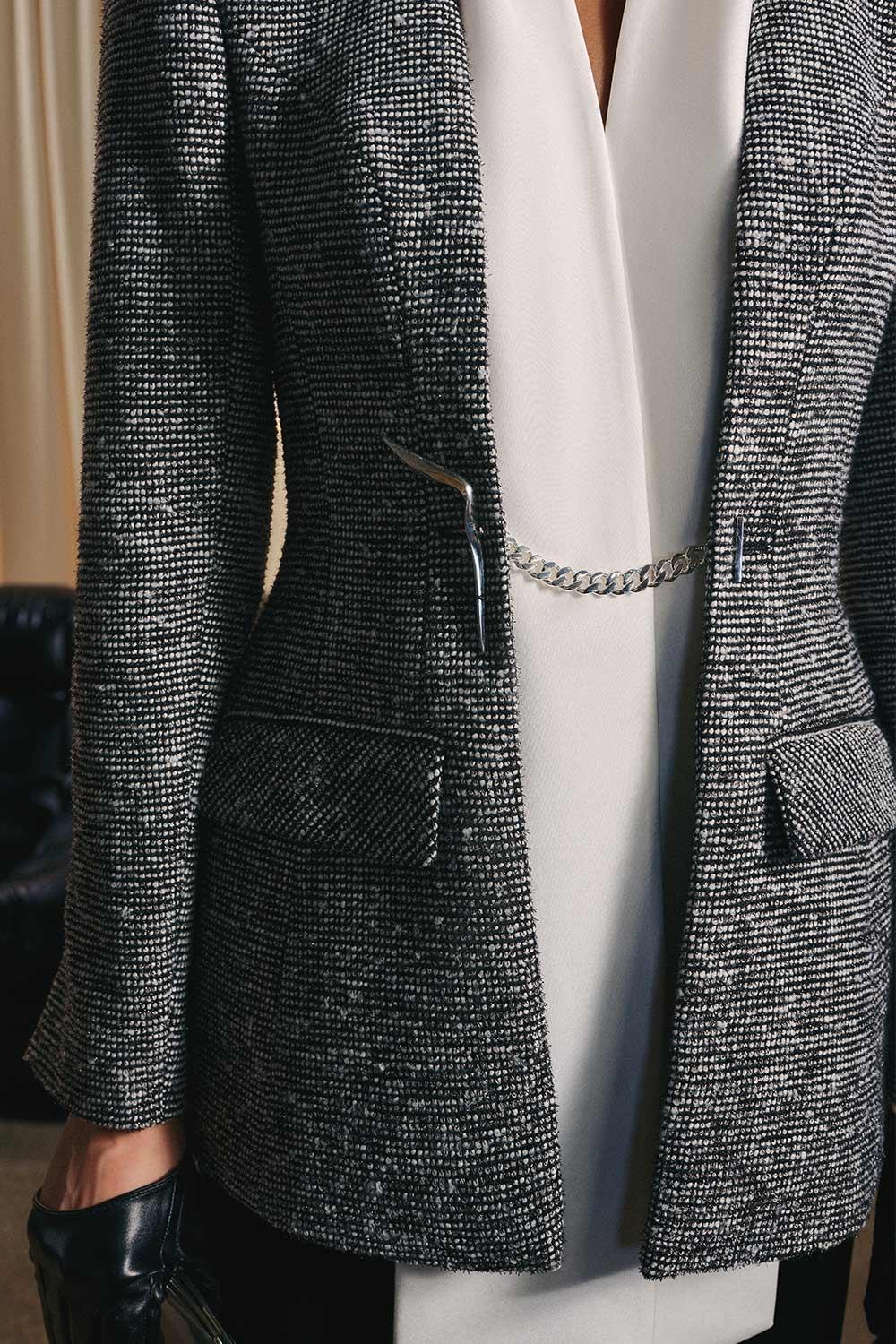 Designed for the modern gentleman, this blazer combines sleek style with practicality. With its structured flap pockets, this blazer offers both a professional and functional touch to any outfit. Made with high-quality tweed, this blazer is a durable and fashionable investment.