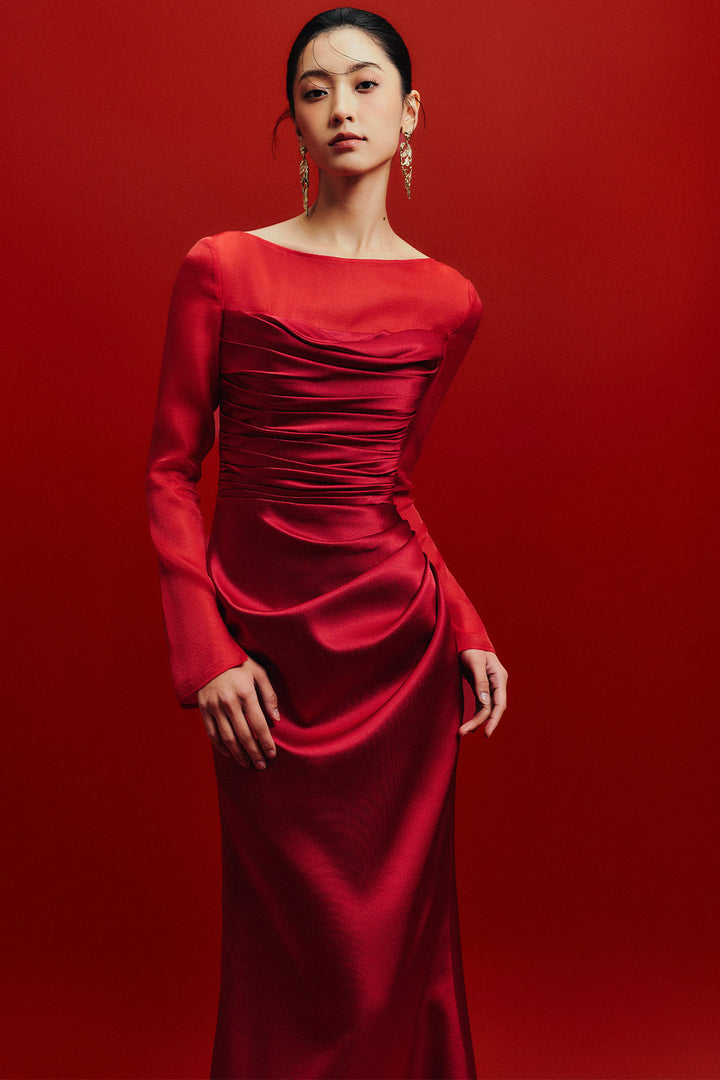 River Silk Sheath Boat Neck Taffeta Silk Floor Length Dress