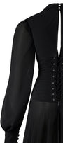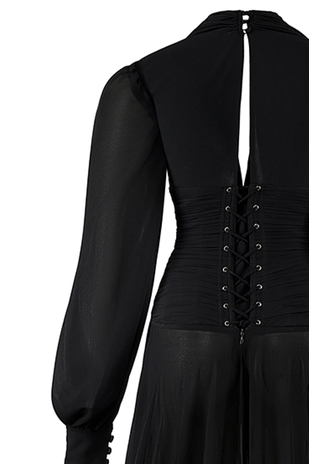 Special Features: Fitted waist with crossover detail, Puff sleeve with button line, Crisscross closure type with zipper at the back, Wavy flare hem, Two layer skirt, Sheer effect