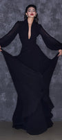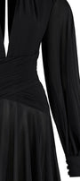 Expertly crafted with a flattering fit and flare silhouette, this  dress features a plunging neckline and flowing chiffon fabric that gracefully skims the floor. Elevate your style with this timeless and versatile piece, perfect for any special occasion.