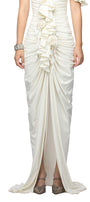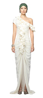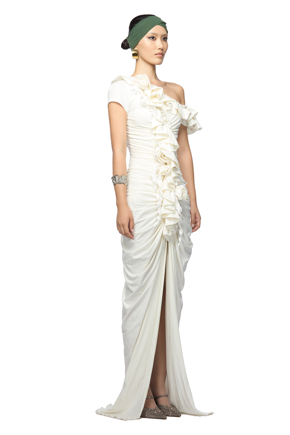 Front slit, Ruffle along the neckline, Gathered body with 3D flowers
