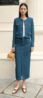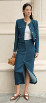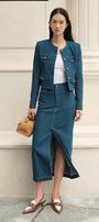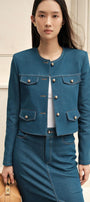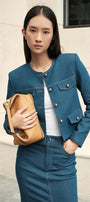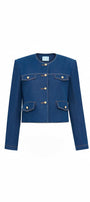 Expertly crafted with 100% cotton denim, the jacket features a cropped silhouette with flap pockets for a modern touch. Perfect for transitioning between seasons and effortlessly pairing with any outfit, this jacket is a must-have for any fashion-forward wardrobe.