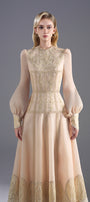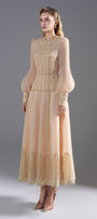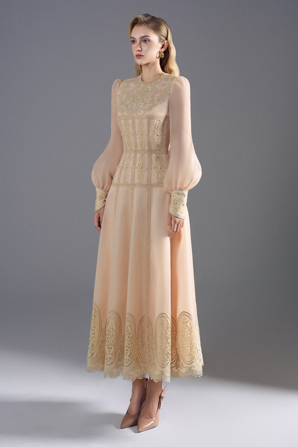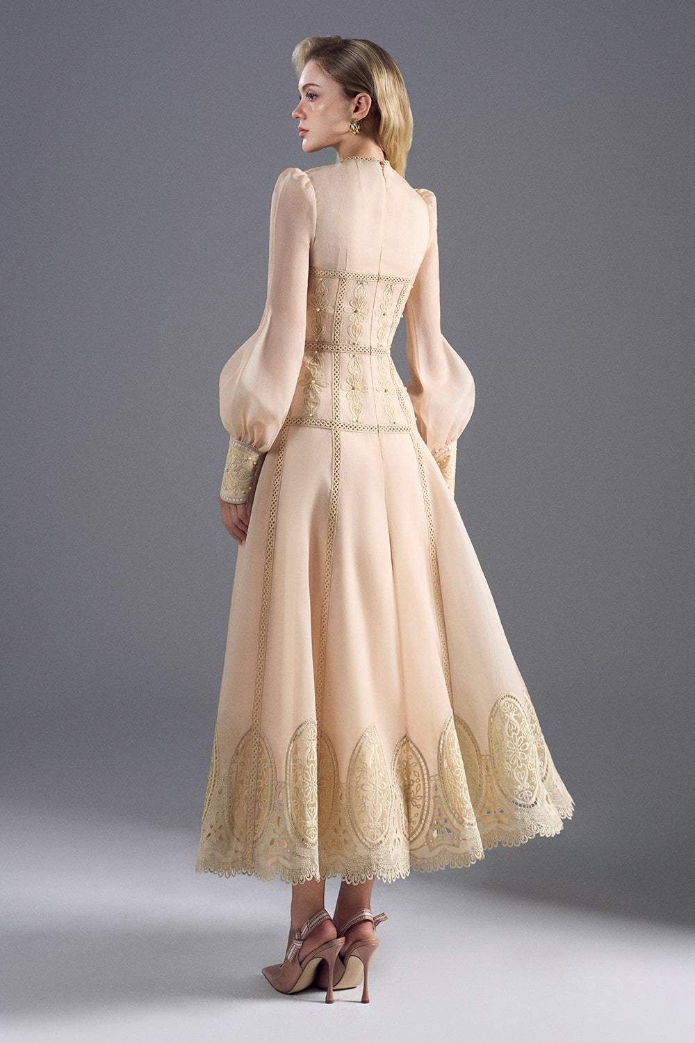 Experience refined elegance with this A-line midi dress, featuring a sophisticated high neck, graceful bishop sleeves, and exquisite embroidery with bead embellishments. Ideal for weddings, cocktail evenings, or upscale gatherings.