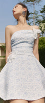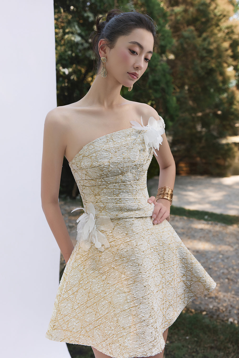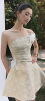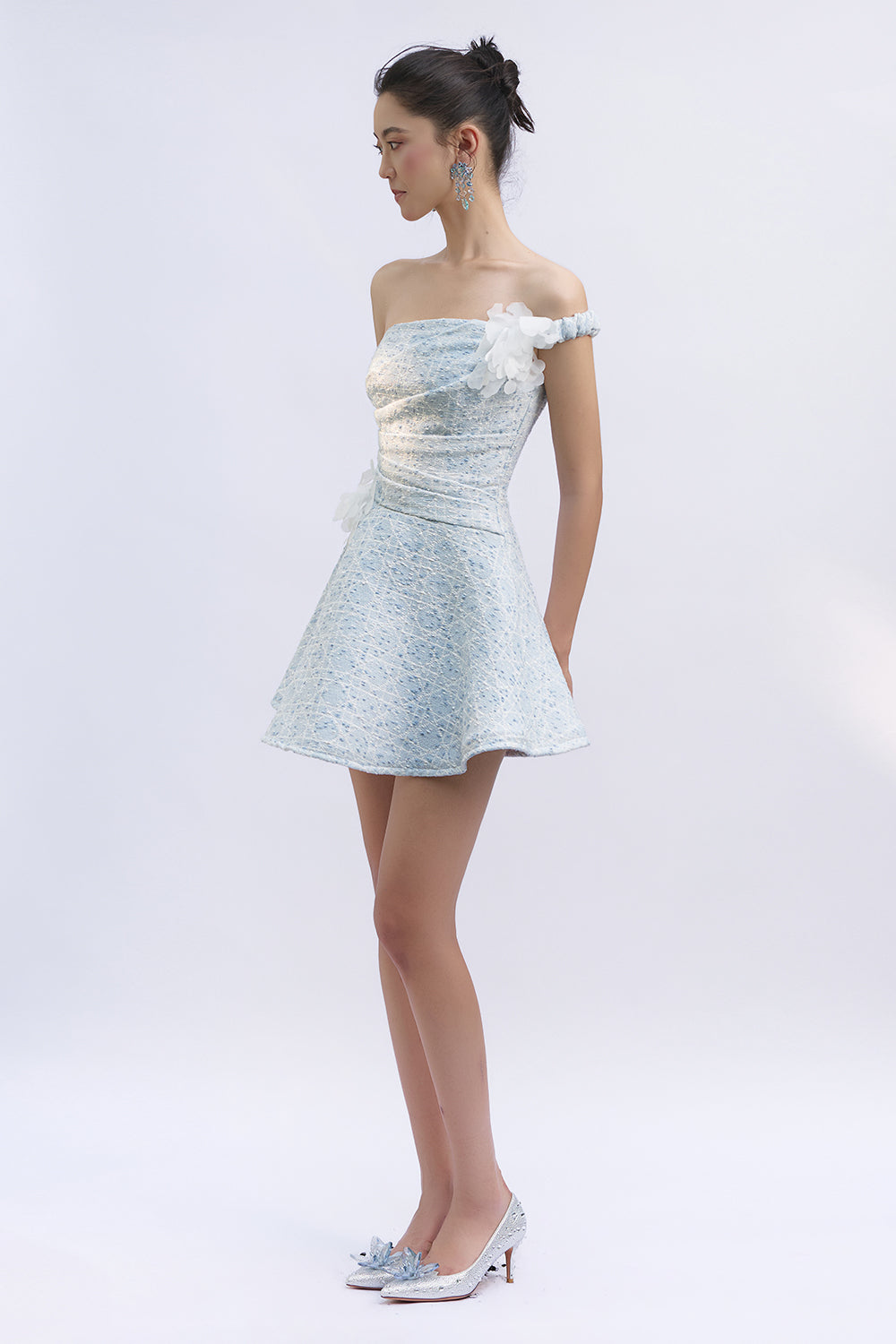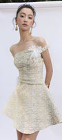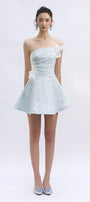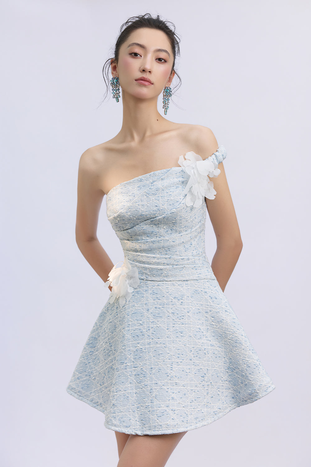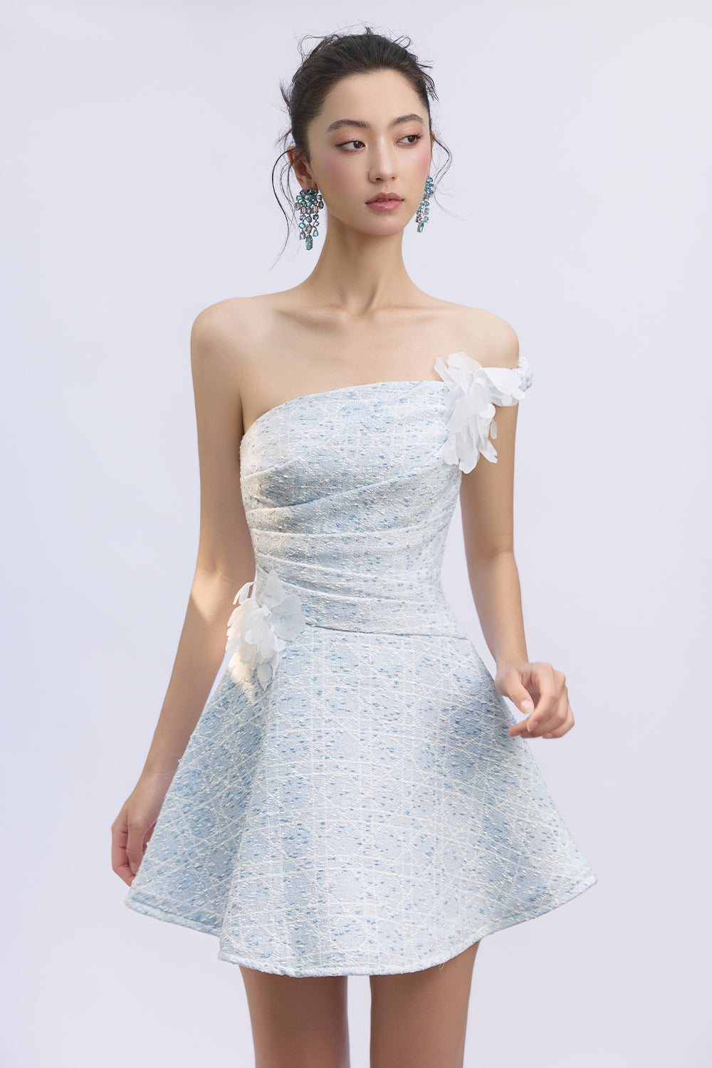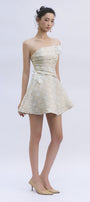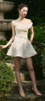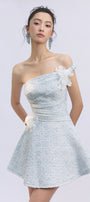 Expertly crafted, this A-line mini dress features an alluring asymmetric neckline and elegant applique embellishments for a refined look. Perfect for cocktail parties, evening gatherings, or upscale events where you wish to make a chic impression.