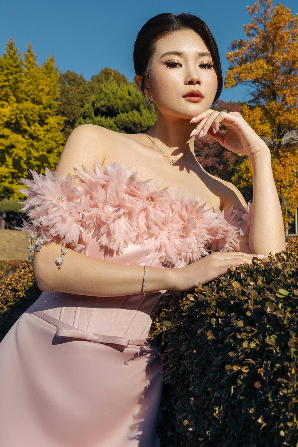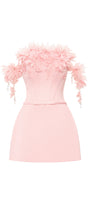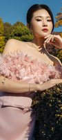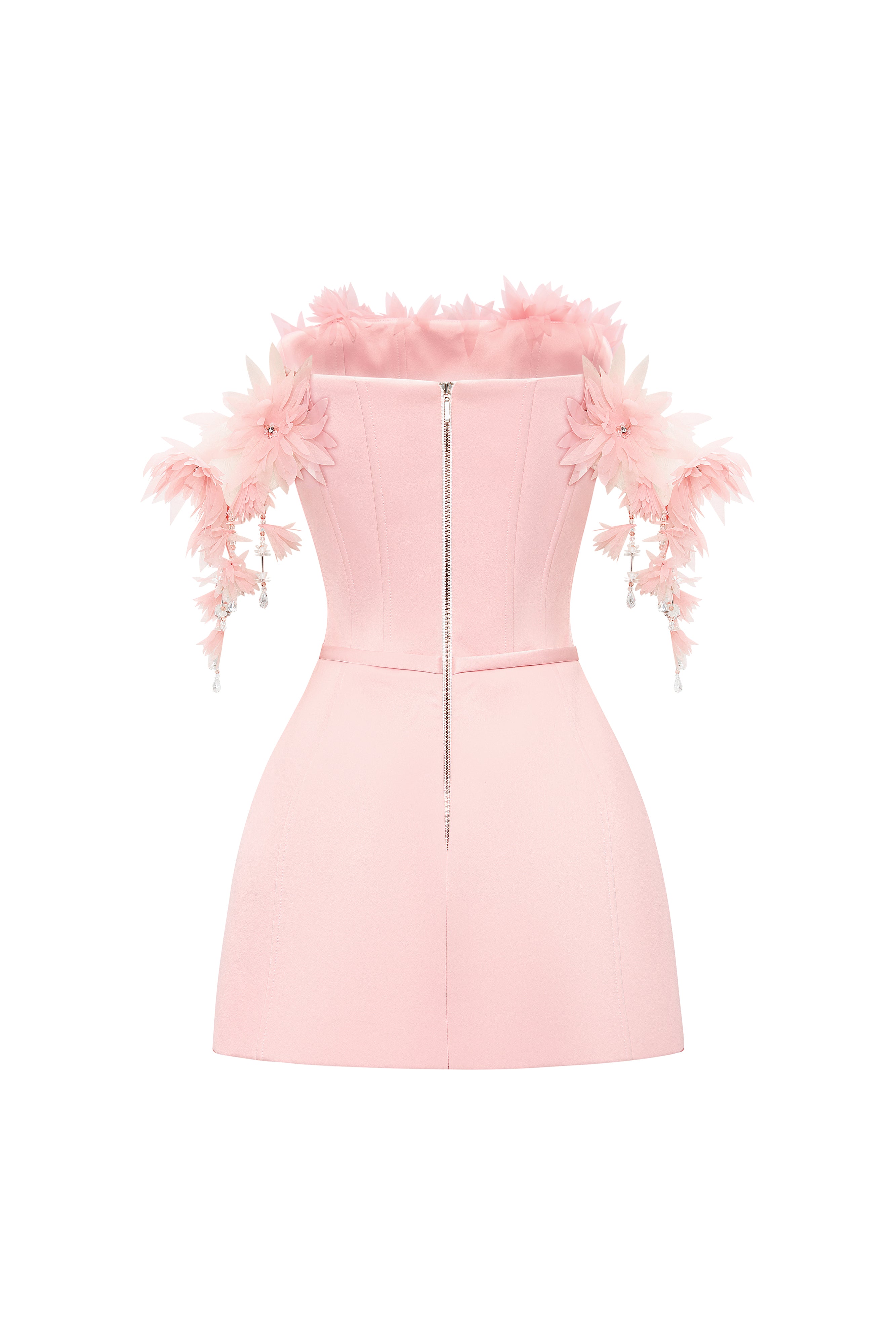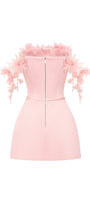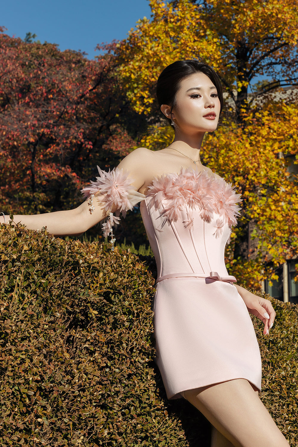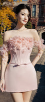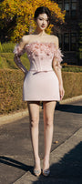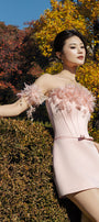 This off-shoulder mini dress features a sleek sheath silhouette in luxurious satin, highlighted by exquisite applique embellishments. Designed for sophisticated elegance, it's an ideal choice for cocktail parties, evening events, or upscale gatherings.