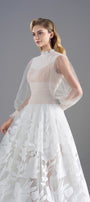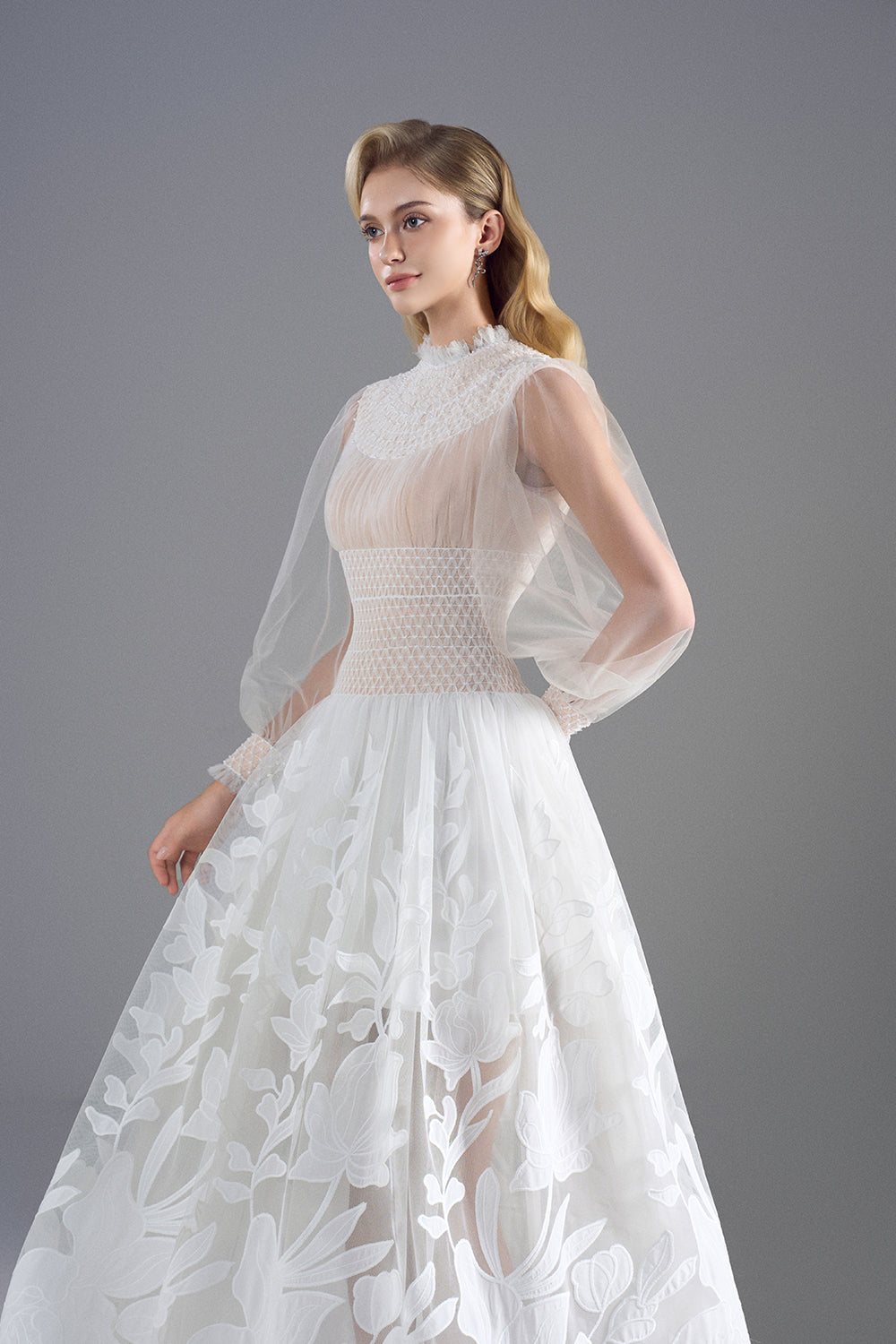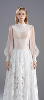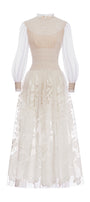 Elevate your wardrobe with this expertly crafted A-line maxi dress, featuring a high neck, elegant bishop sleeves, intricate smocking, and delicate applique accents. Ideal for formal gatherings, garden parties, or sophisticated soirées.