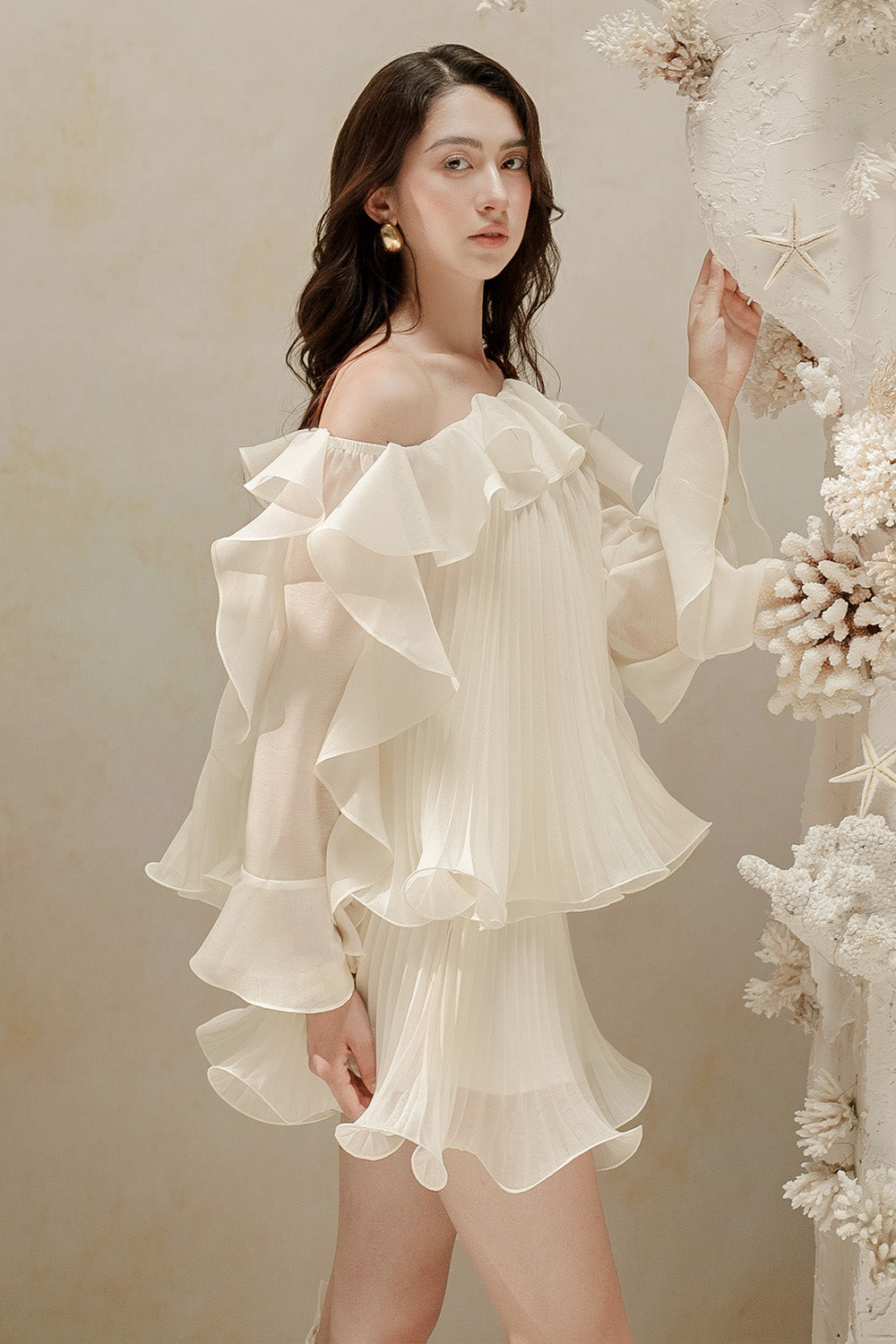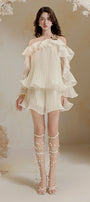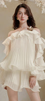 The shorts feature a sleek straight cut with a distinctive wavy hem, adding subtle movement and visual interest. Crafted from lightweight organza, the pleated design enhances texture and dimension, offering a refined yet playful silhouette perfect for elevated summer styling.