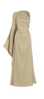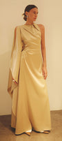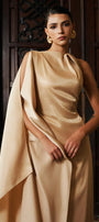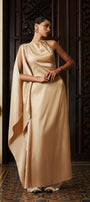 Special Features: Asymmetric Draping, Shimmering Satin, Flowing Slit Panels