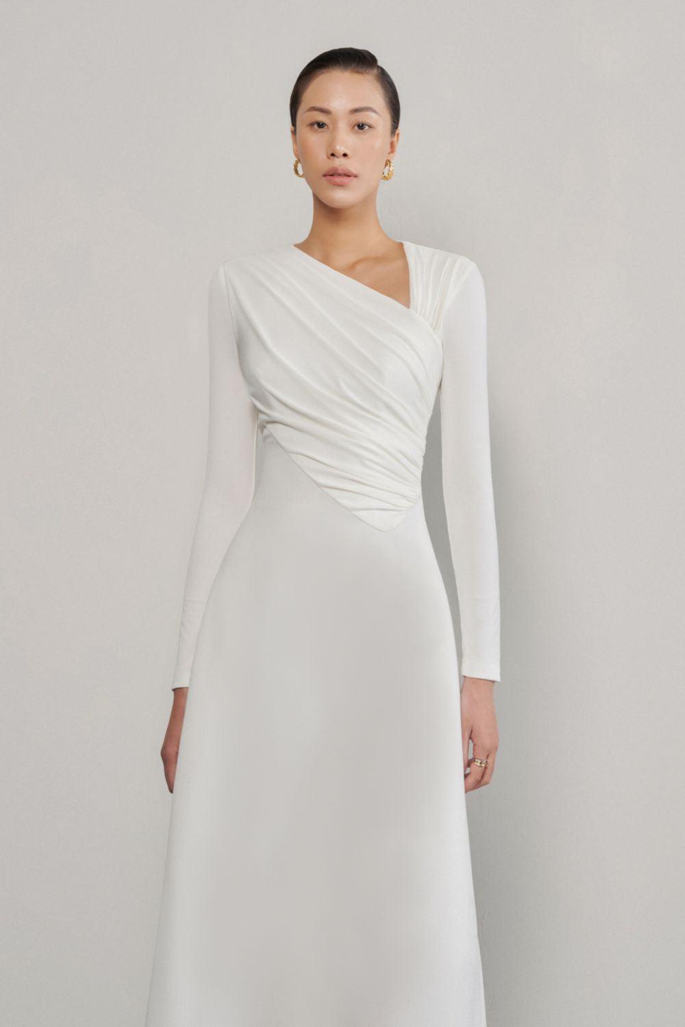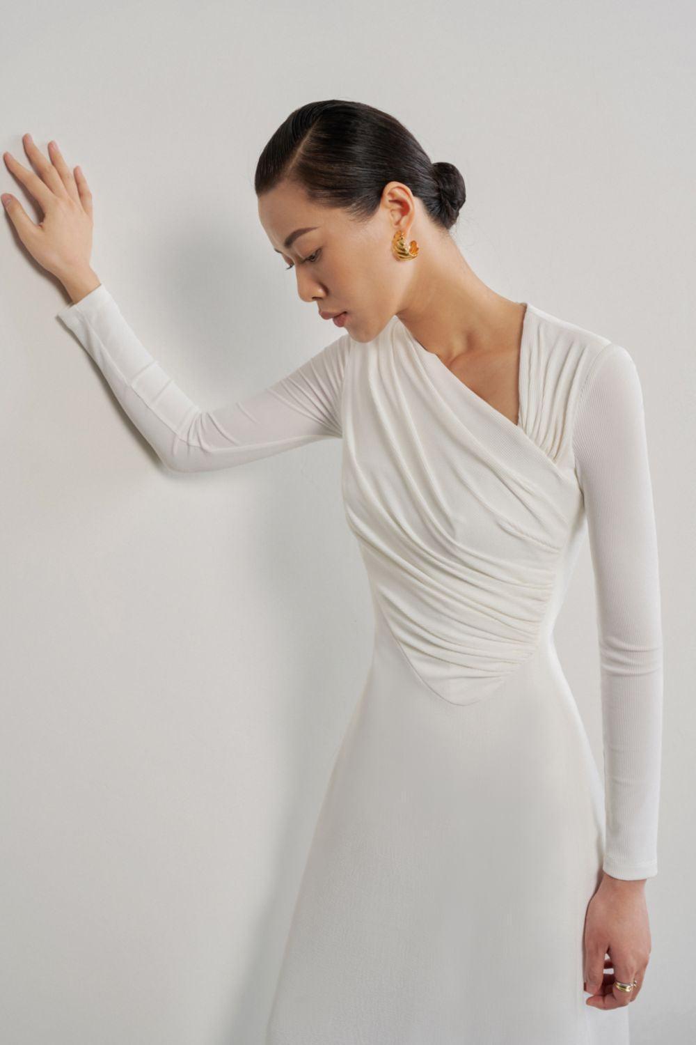 Lopsided A-line Long Sleeved Crinkle Crepe Midi Dress