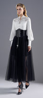 Expertly crafted with pleated bishop sleeves and a sophisticated high neck, this straight silhouette shirt features elegant applique accents. Its refined details make it ideal for both professional events and elevated gatherings.