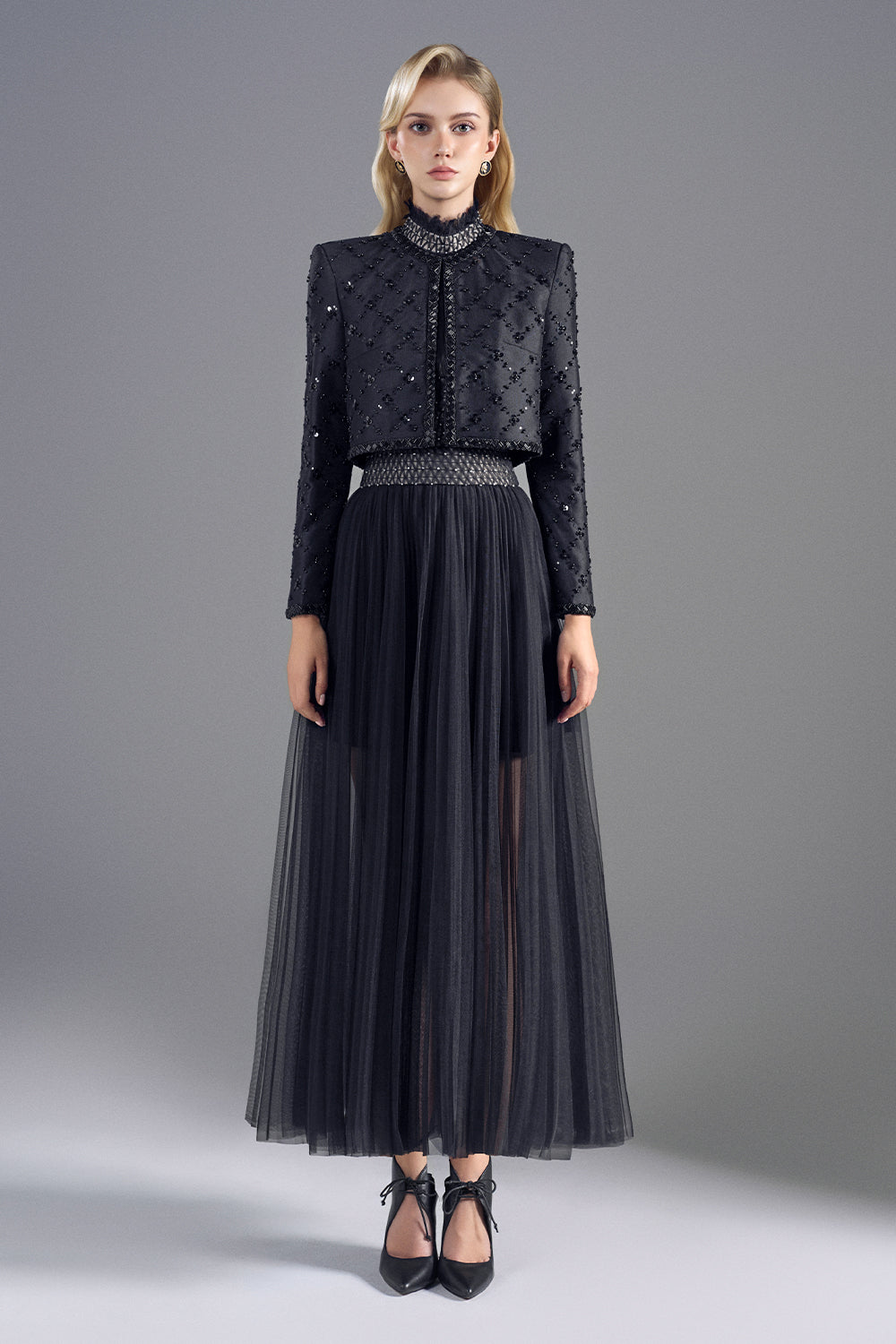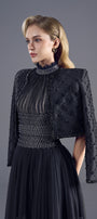 Expertly crafted, this straight-silhouette jacket features a sophisticated high neck and regular sleeves, finished with stunning bead embellishments. Perfect for elegant evenings, professional events, or adding a refined touch to your daily wardrobe.