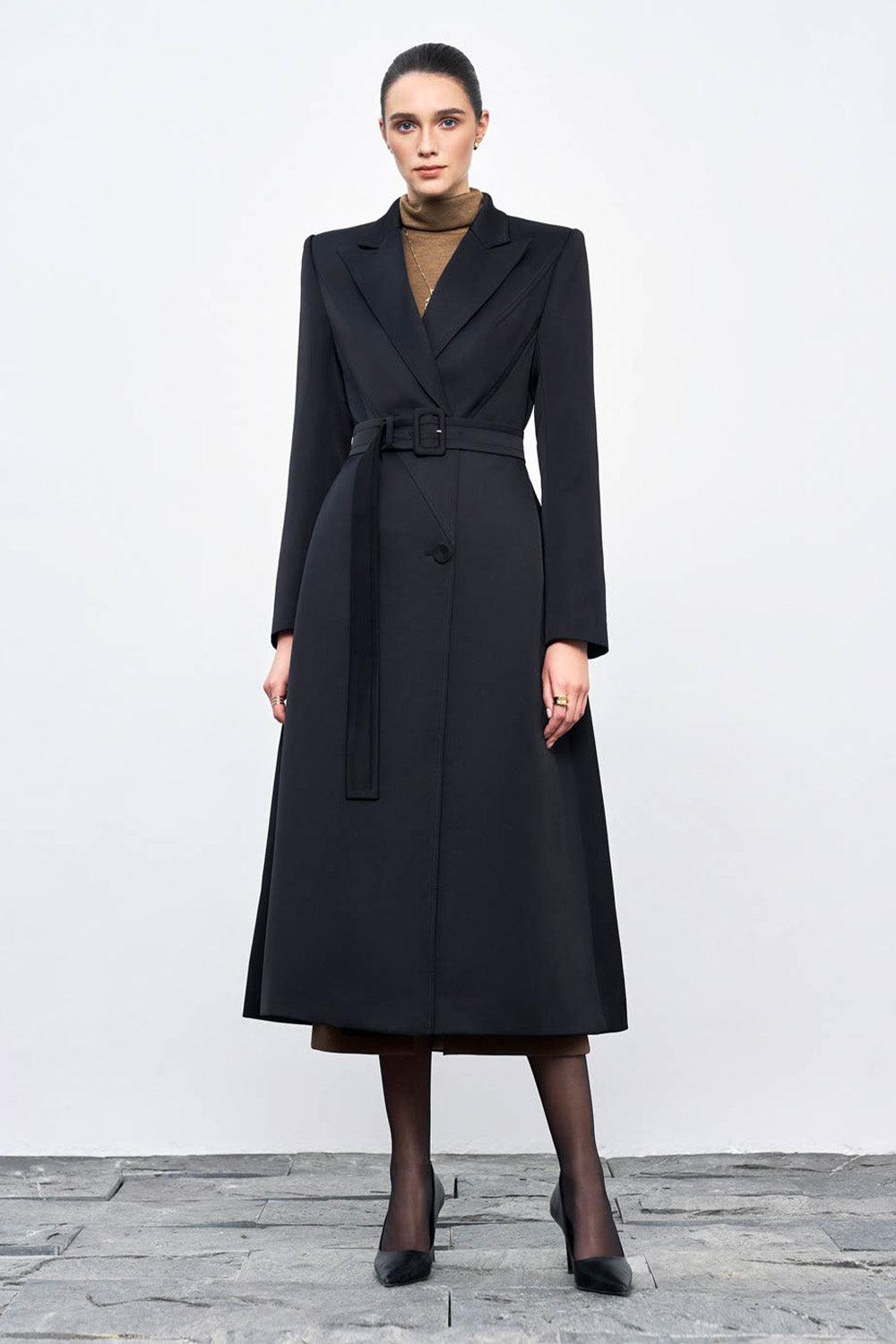Expertly crafted with a classic A-line silhouette, the trench coat is made from high-quality taffeta material and features a stylish notch lapel. Its calf-length design offers both elegance and practicality, making it a timeless addition to any wardrobe. Keep yourself warm and stylish in any weather with this versatile and sophisticated trench coat.