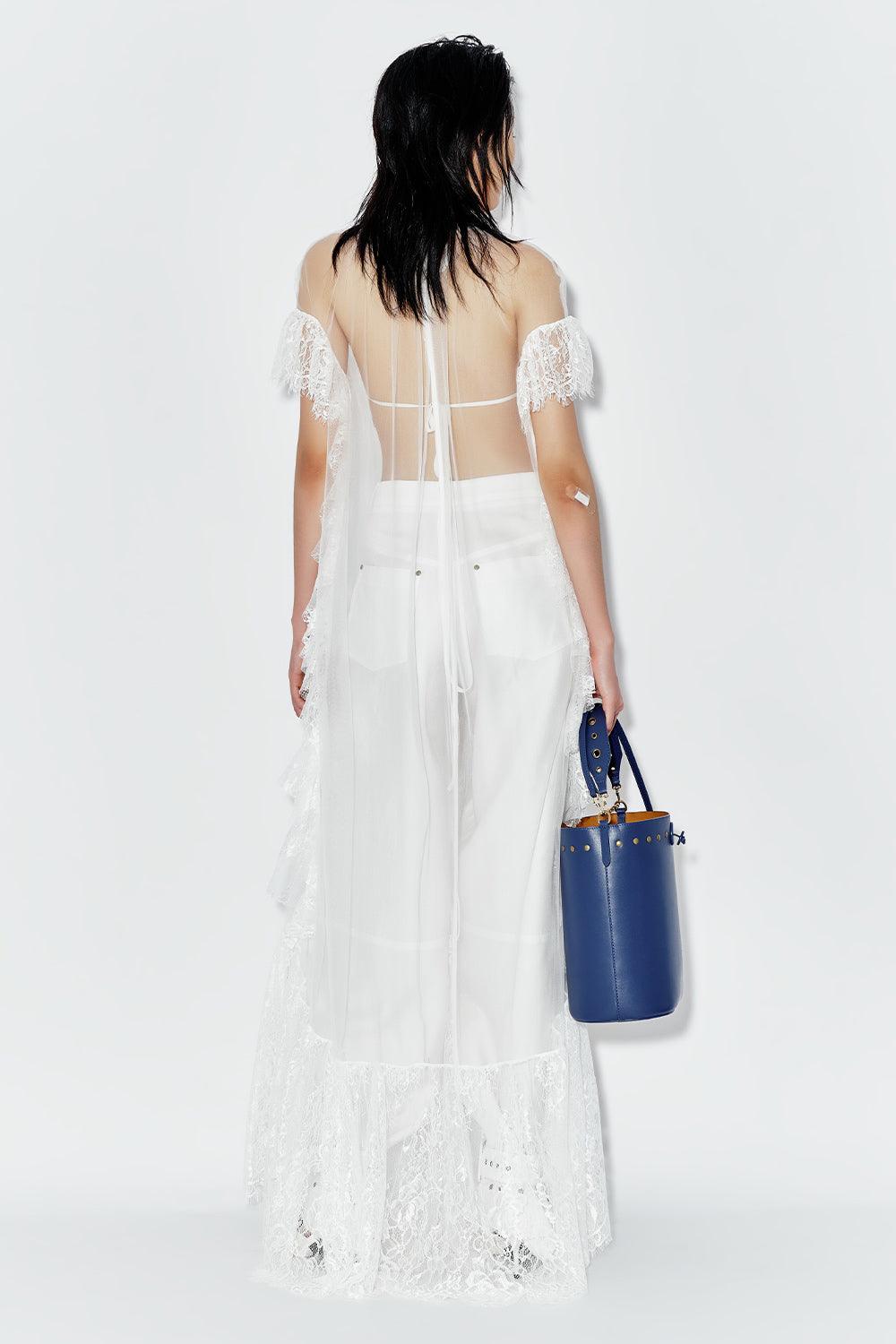 Flute sleeve with lace trim, Gathered neck, Sarong design with lace at the bottom, Lace seam on both side, See-through design