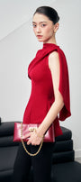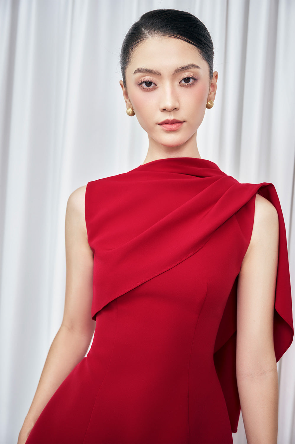 Draped crossover one-shoulder scarf neck, Dart lines, Back zipper