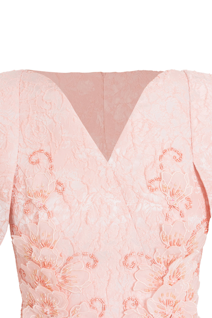 This midi dress features a sophisticated jacquard fabric with intricate embroidery, offering a refined texture and visual interest. Its cape sleeves add a dramatic yet elegant silhouette, while the flattering V-neckline enhances the neckline with subtle allure. Designed to contour the body gracefully, this dress is perfect for formal occasions where style and poise are paramount.