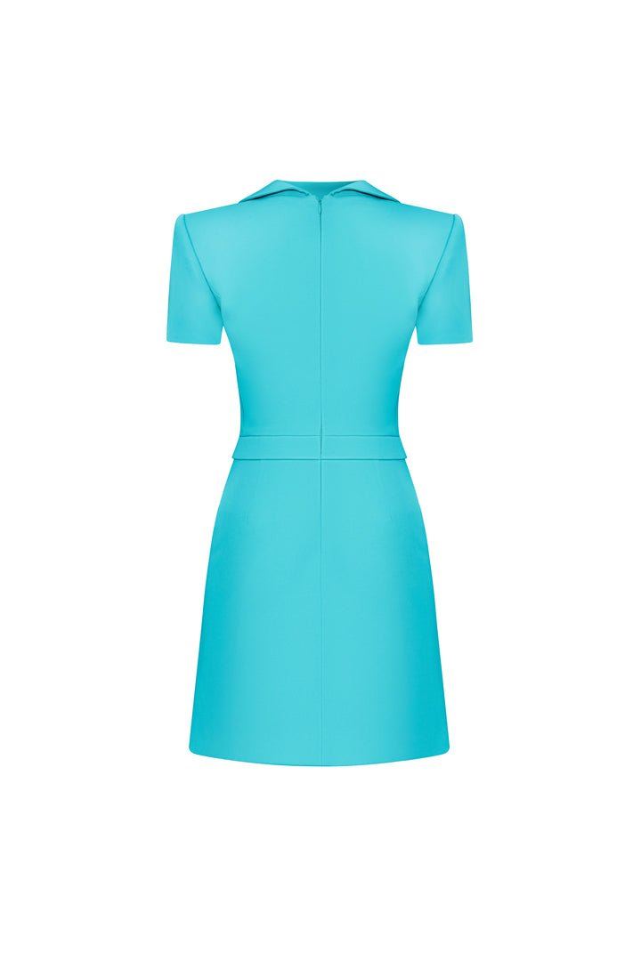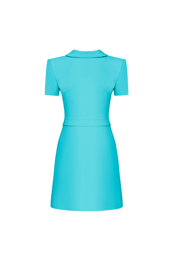 The dress combines expert tailoring with luxurious silk crepe fabric. Its sleek sheath silhouette and sophisticated high neck create a refined, polished look. Designed for those who value precision and elegance, this mini dress delivers timeless style with a modern edge.