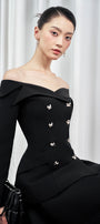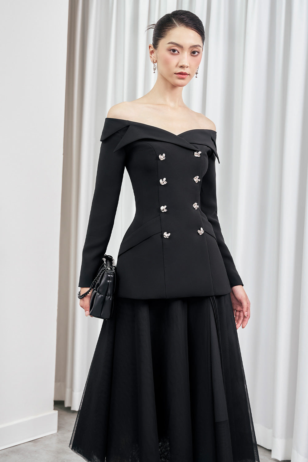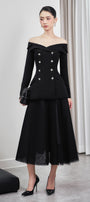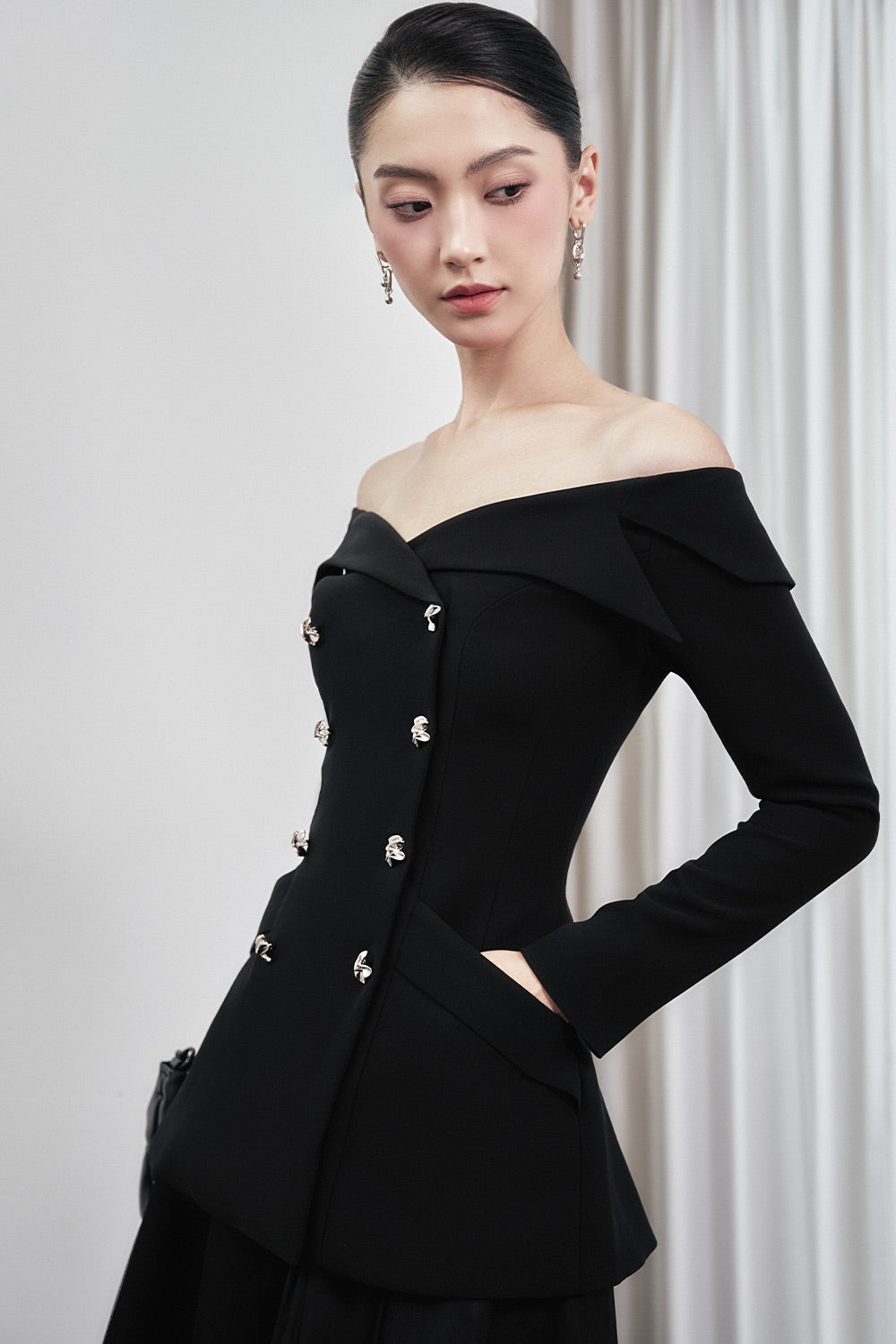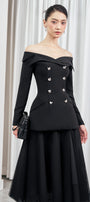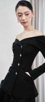 Double-breasted with silver button, Off-Shoulder neckline with folded lapel
