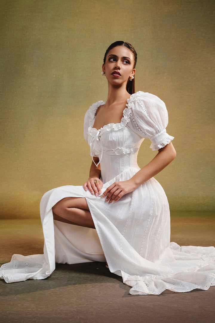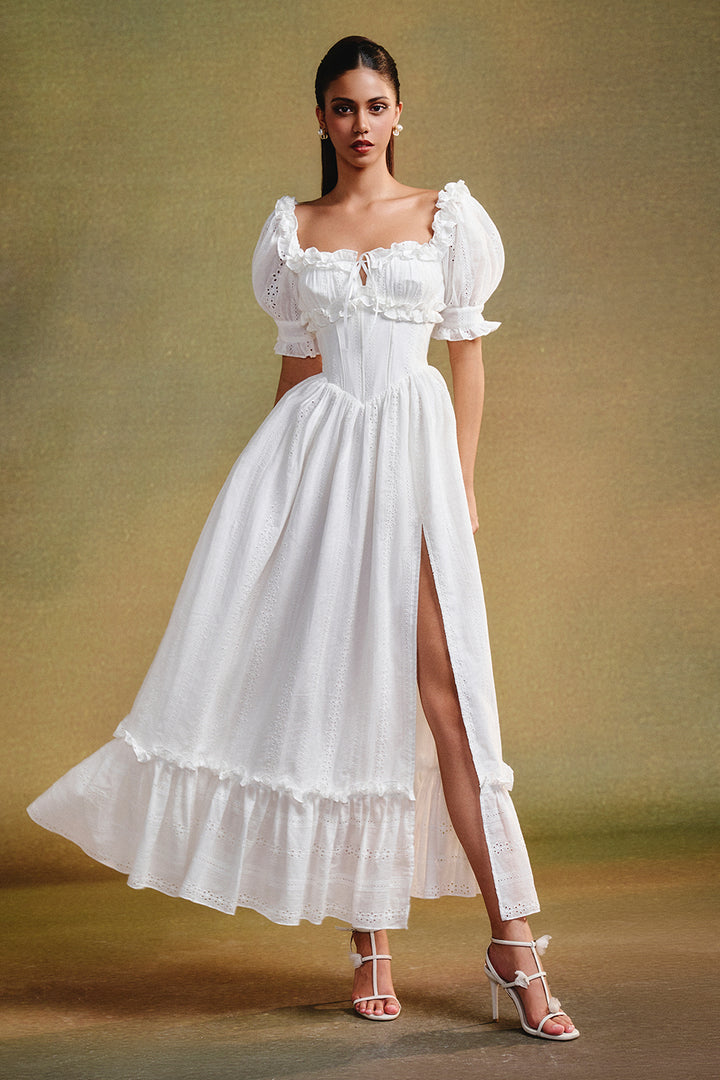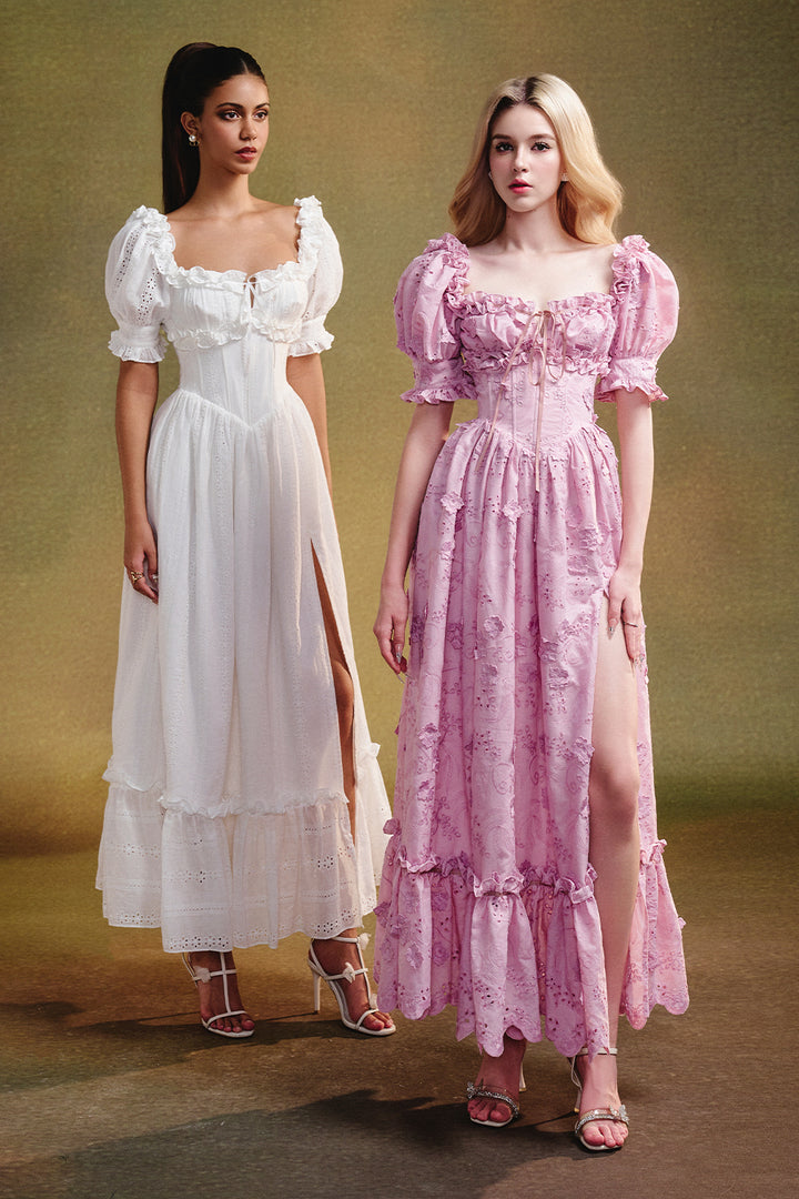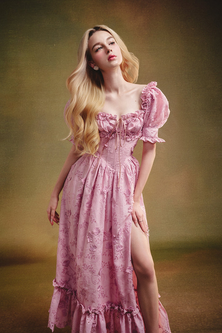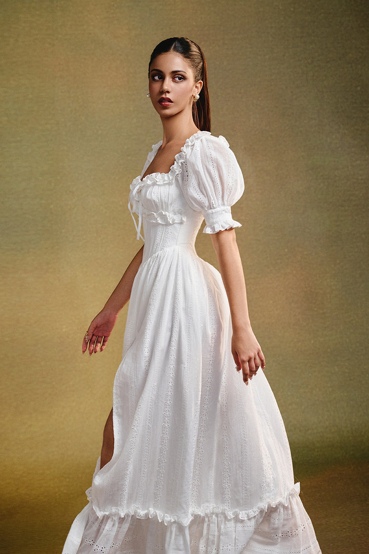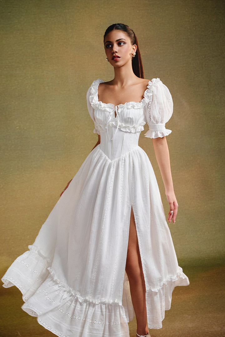 Expertly crafted from delicate lace, this A-line maxi dress features a refined square neckline, puff sleeves, gathered detailing, and elegant ruffle embellishments. Ideal for weddings, garden parties, or any elegant soirée where timeless charm is celebrated.