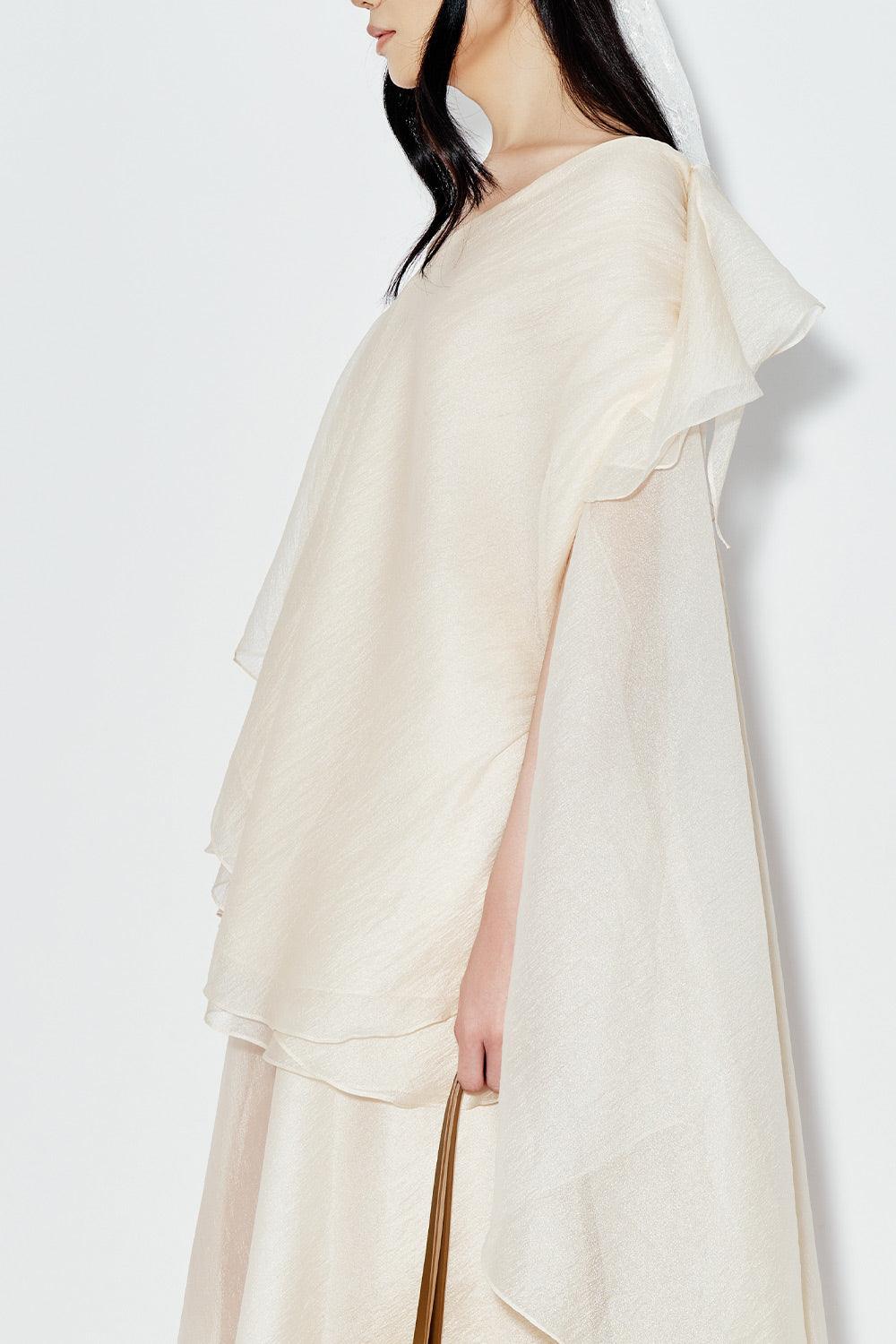 Ruffle shoulder, Front zipper, Asymmetric ruffle layer hem