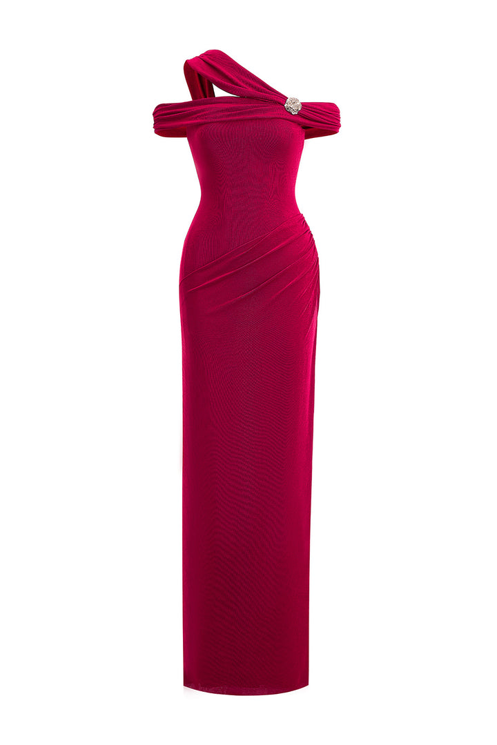 Plumeria Sheath Cold Shoulder Sleeved Elastic Cotton Floor Length Dress