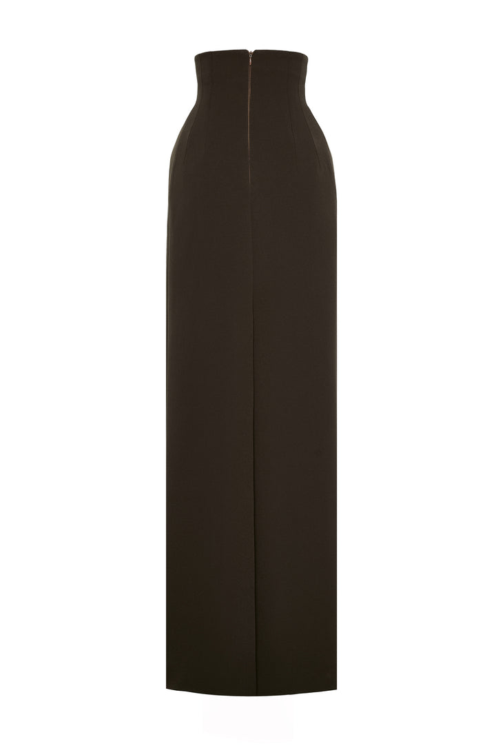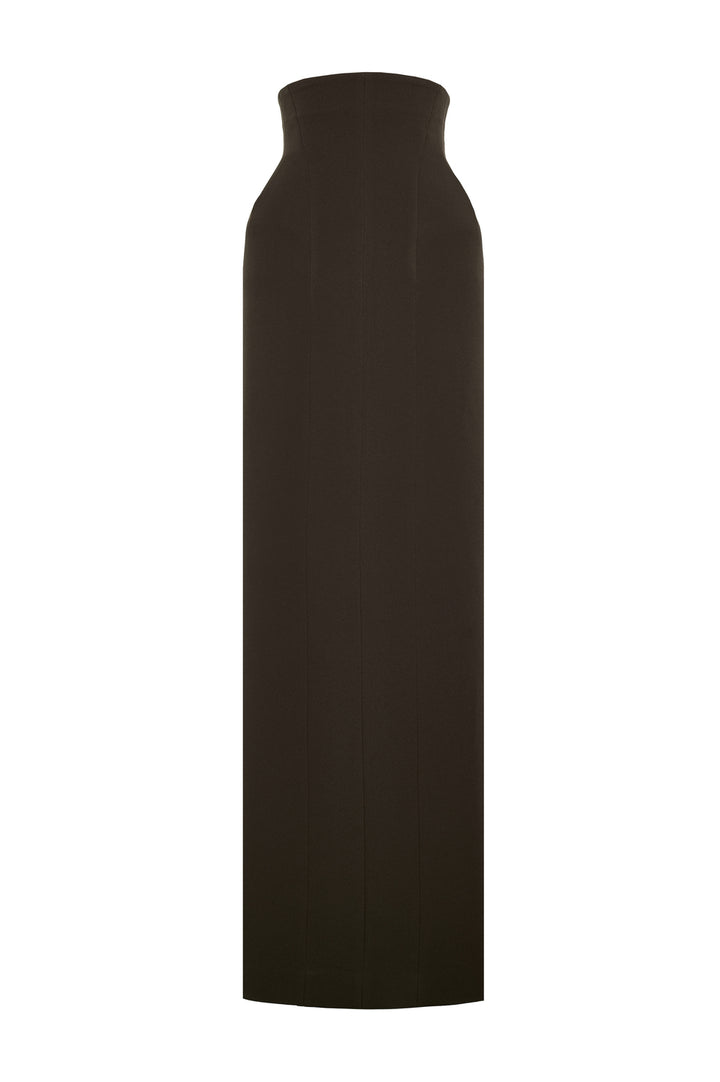 The skirt features a high waist design that flatters the silhouette by elongating the legs and enhancing the waistline. Expertly tailored with dart lines for a precise fit, it contours smoothly over the hips while the subtle puffiness adds volume and refined dimension. Crafted from crepe fabric, this floor-length skirt offers both structure and fluidity, making it ideal for elegant, polished looks that balance classic tailoring with modern detail.