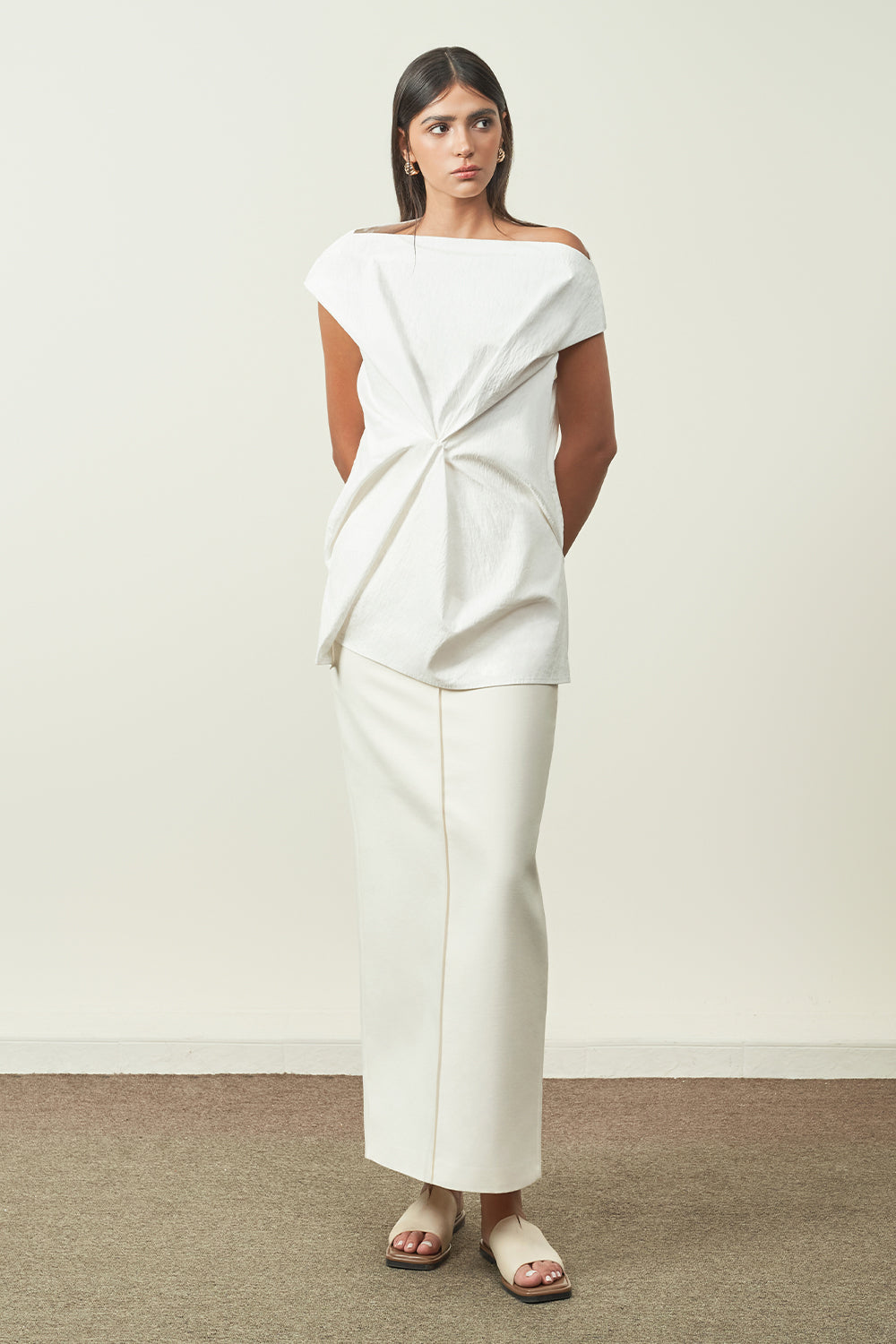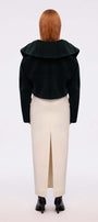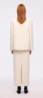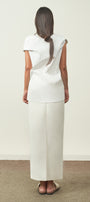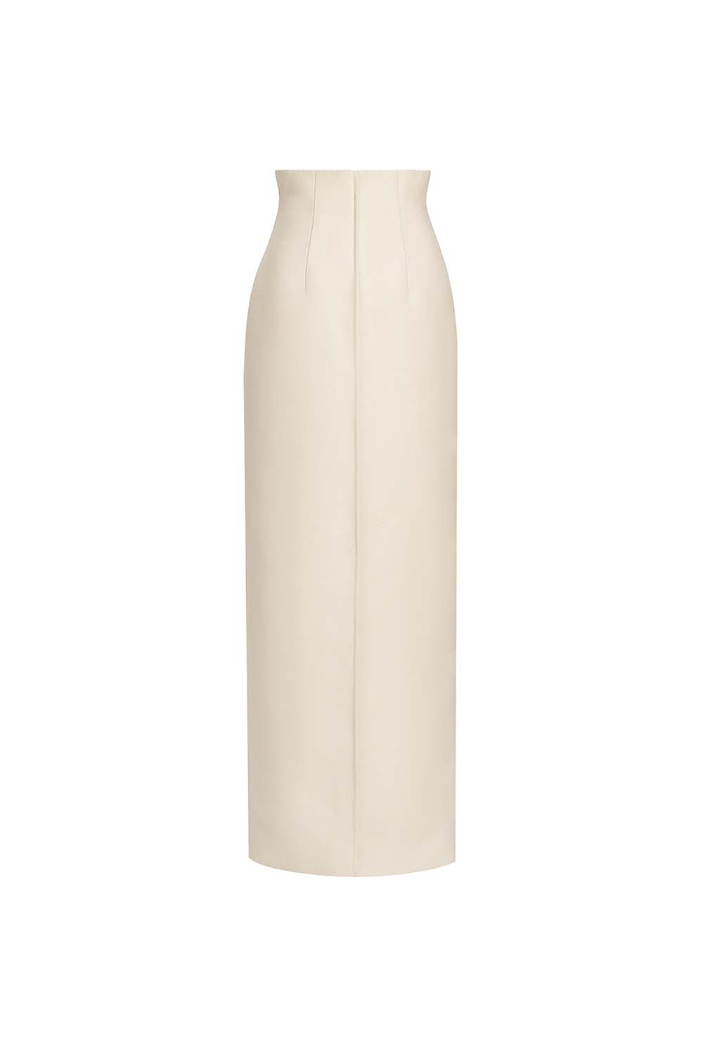 The straight cut flatters the figure, making it an excellent choice for business environments or upscale events/galas. Its hard form ensures it retains its shape, offering a polished and sophisticated appearance throughout the day to night. The discreet unique selling point is the edgestitch right in the middle front of the dress, making the skirt a testament to refined fashion.