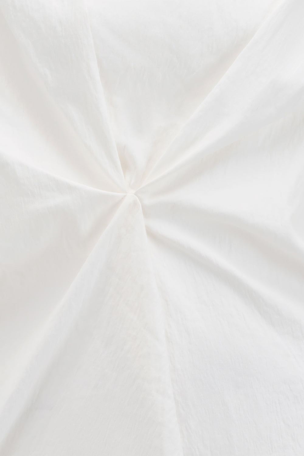 Over-the-hip length, Radial draping at the waist, Asymmetric boat neckline