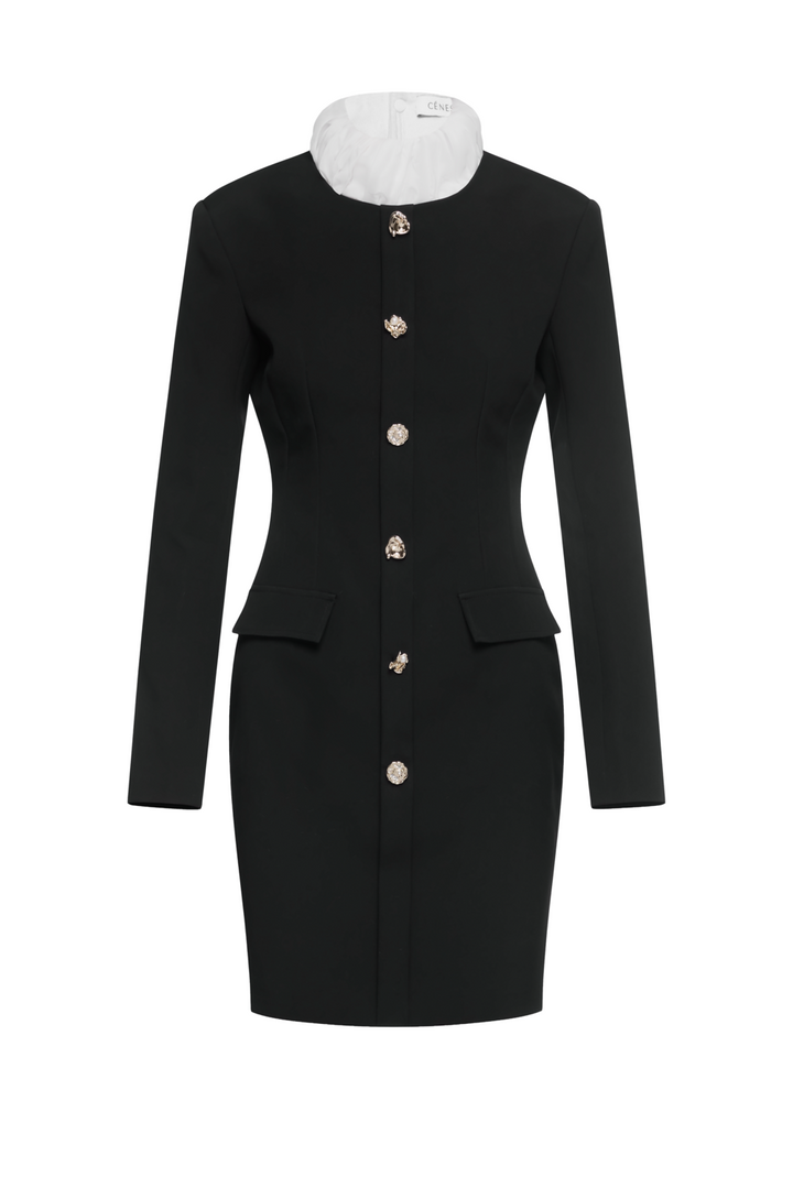 Expertly tailored for modern elegance, this cotton sheath mini dress features a sophisticated high neck, regular sleeves, and chic button embellishments. Ideal for cocktail parties, semi-formal events, or an elevated daytime look.
