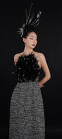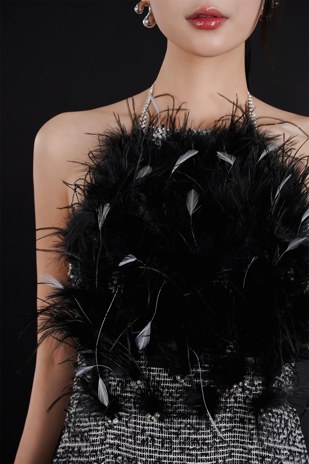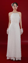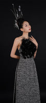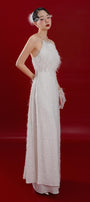 Halter-Neck Design, Feather accents in front of chest, High side slit
