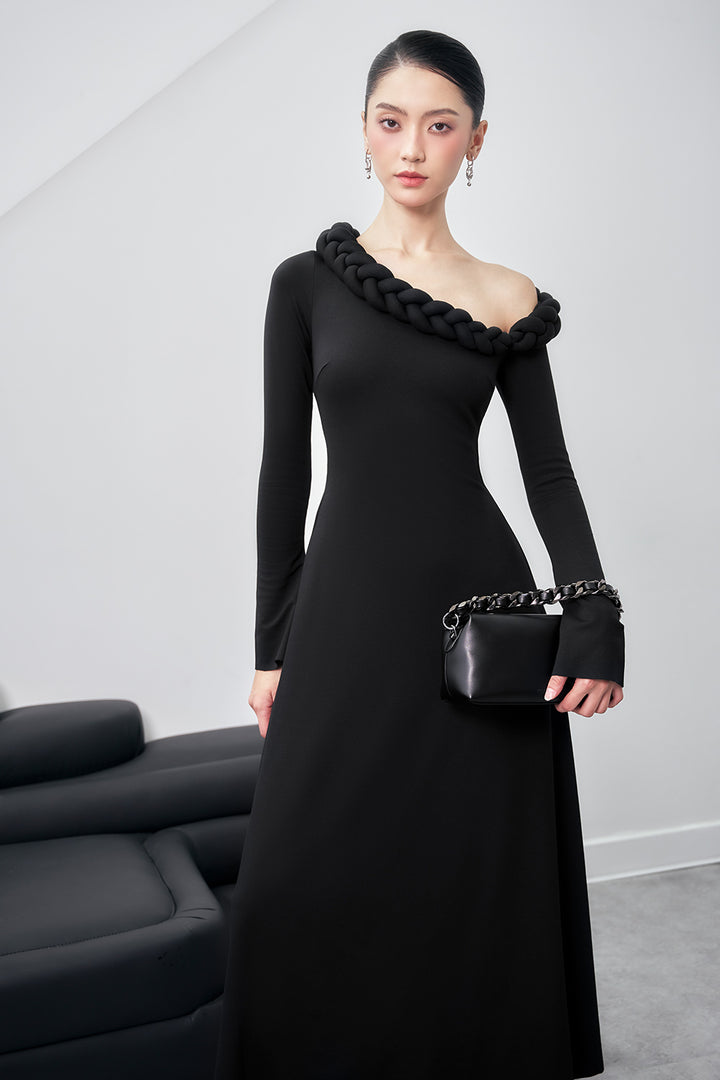 Special Features Asymmetrical braided neckline ditail, Wavy hemline, Dart lines, Back zipper