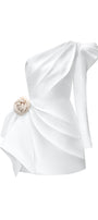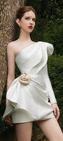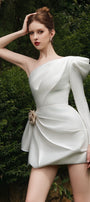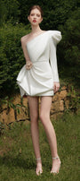 The dress is pure playful glamour. Featuring a sleek one-shoulder design and luxurious taffeta silk, this mini dress offers a fun and flirty silhouette that’s perfect for turning heads. Its A-line shape adds a touch of movement while keeping things effortlessly chic. Get ready to dance, laugh, and shine.
