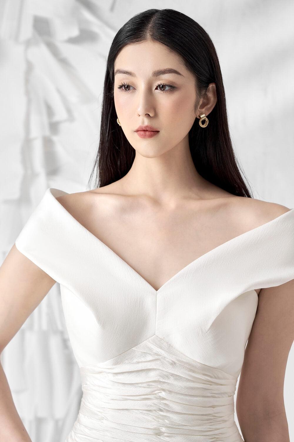 تمتلك تصميم ساحر مع تصميم كتف منسدل مما يخلق جاذبية لا تقاوم لمرتديها. ساعدت الخطوط المتجمعة عند الخصر على تعزيز النعومة وخلق تأثير ملفت للنظر على الفستان.