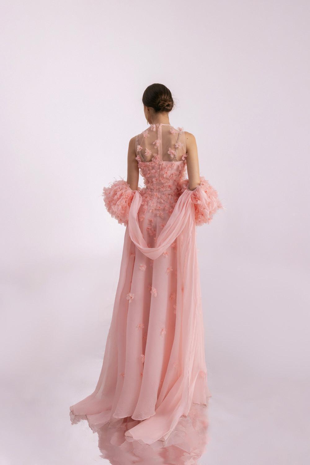 مصنوع من أجود أنواع حرير الأورجانزا ومزين بزخارف زهور رقيقة، هذا الفستان بطول الأرض ينضح بالأناقة والرقي. مثالي لأي مناسبة رسمية، وسيجعلك تشعر وكأنك عمل فني حقيقي.